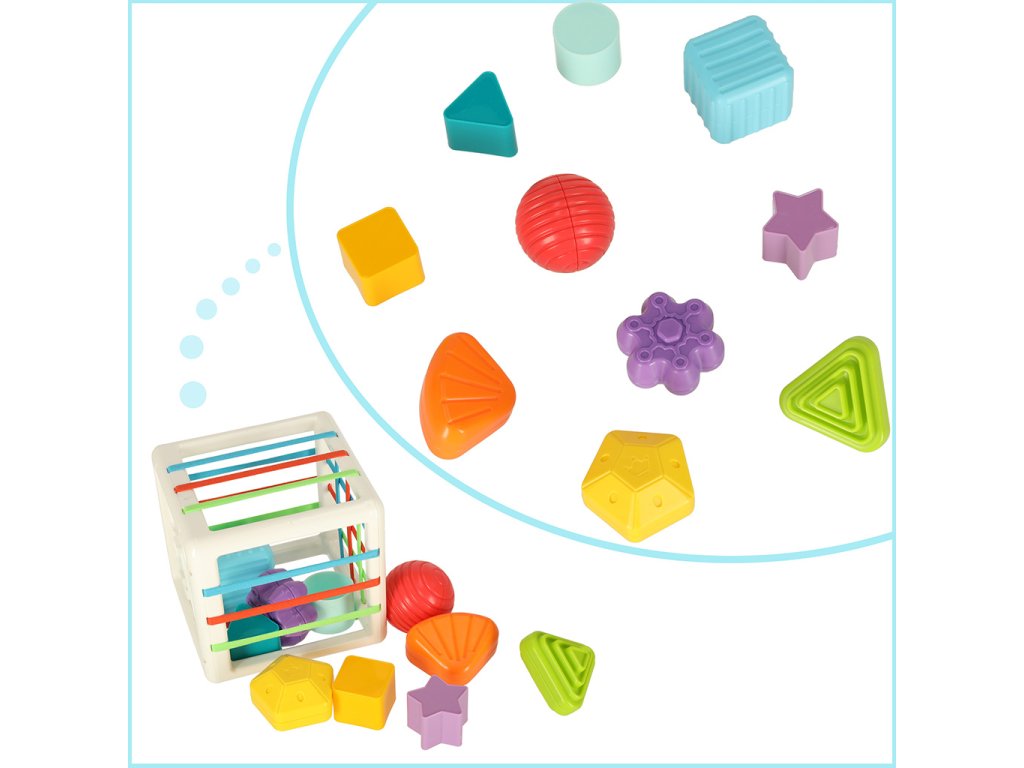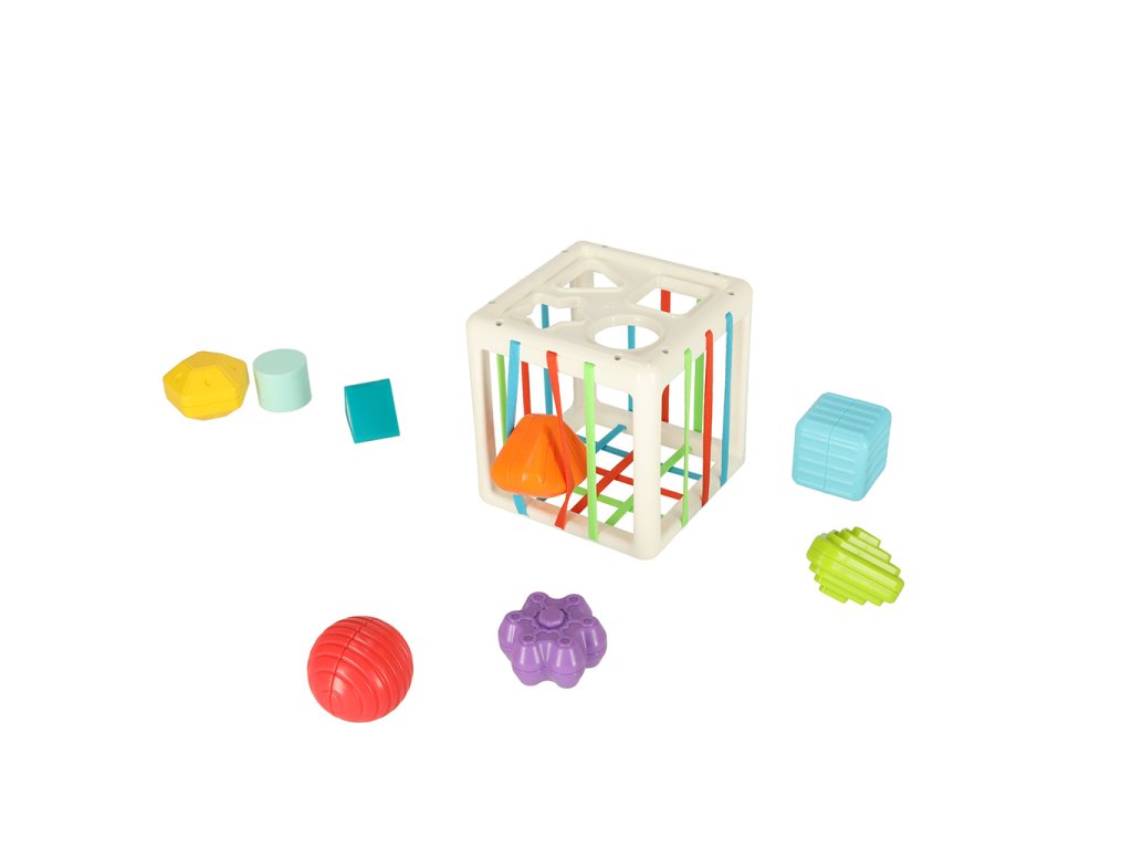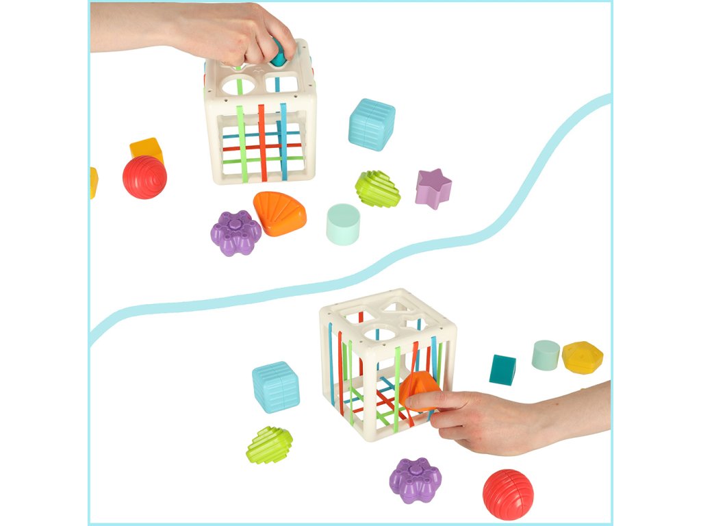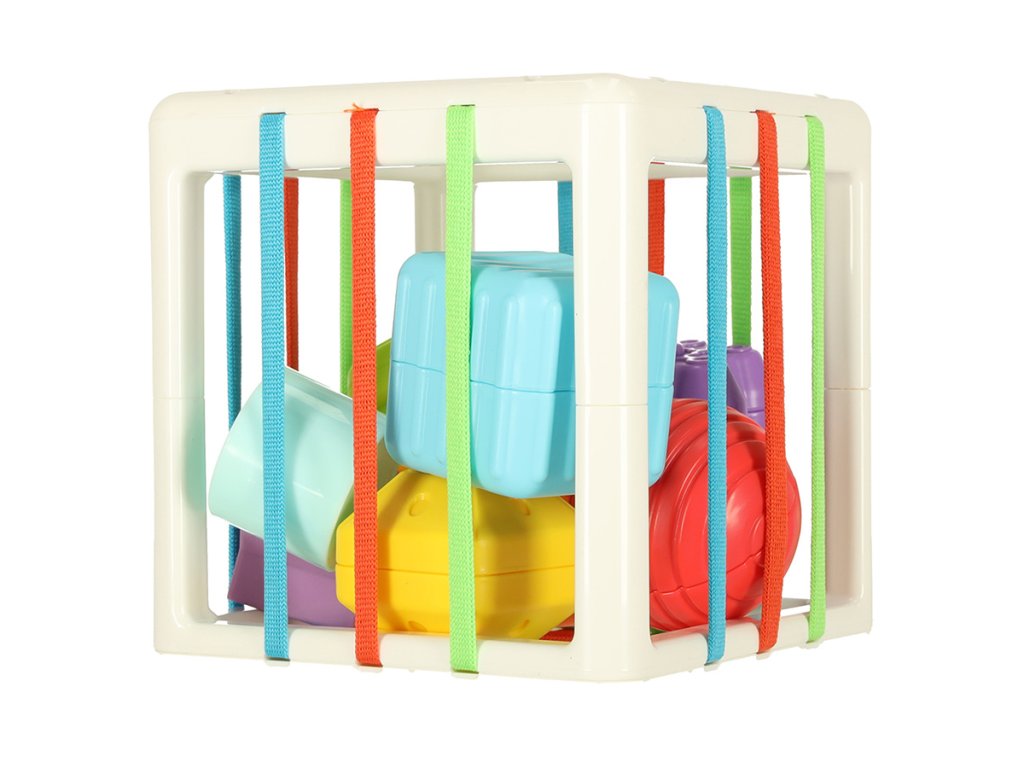 Hrát si s třídičem je velmi jednoduché - batole musí vkládat barevné dílky do kostky. Tento třídič je však trochu jiný. Kromě obvyklých výřezů ve tvaru barevných doplňků má také stěny s gumovými pásy kterým lze kostky také protlačit!
