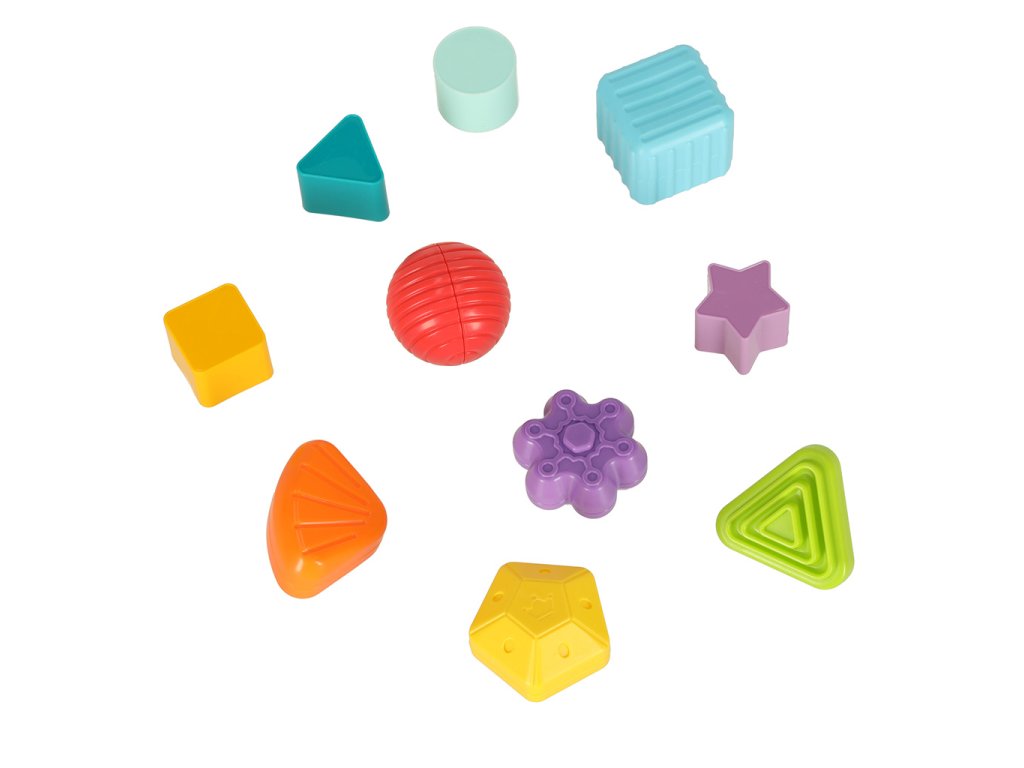 Každý blok má jiný tvar a barvu - to je skvělá příležitost naučit se názvy barev a základních tvarů. Každý blok má však také jinou strukturu. Různé textury stimulují prsty a bude mít pozitivní vliv na jeho citlivost a schopnost rozpoznávat tvary!