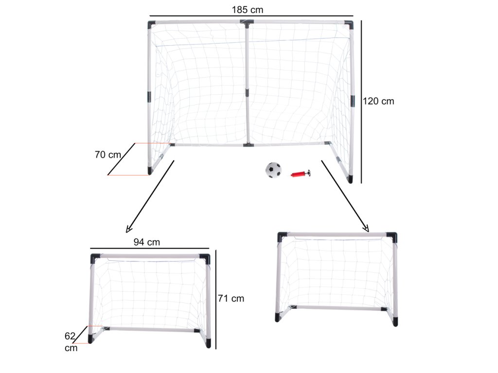 Díky modulární konstrukci vznikne po sestavení jedna velká fotbalová branka nebo dvě malé branky - můžete se tak přizpůsobit rozměrům a typu hřiště! Velká verze má rozměry až 185 cm na šířku a 120 cm na výšku!