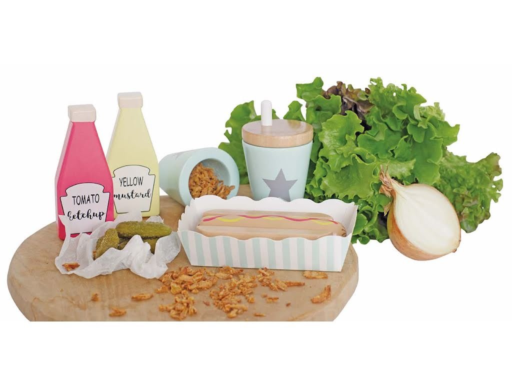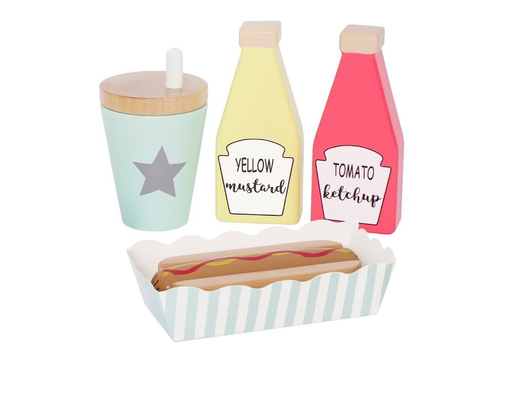 S naší chutnou sadou hot dogů nebudete mít hlad celé hodiny. Sada hot dogů obsahuje vše, co si můžete přát. Součástí sady Hot dog Jabadabado je samozřejmě také nápoj a párek pro větší luxus. Náš hot dog set obsahuje: 1 hot dog 1 housku na párek v rohlíku 1 uzavíratelný kelímek s brčkem 1 láhev kečupu 1 láhev hořčice 1 párek 1 balení "s sebou" Barva: Věk: 2+ Materiál: dřevo Rozměry: 19 x 12 x 19