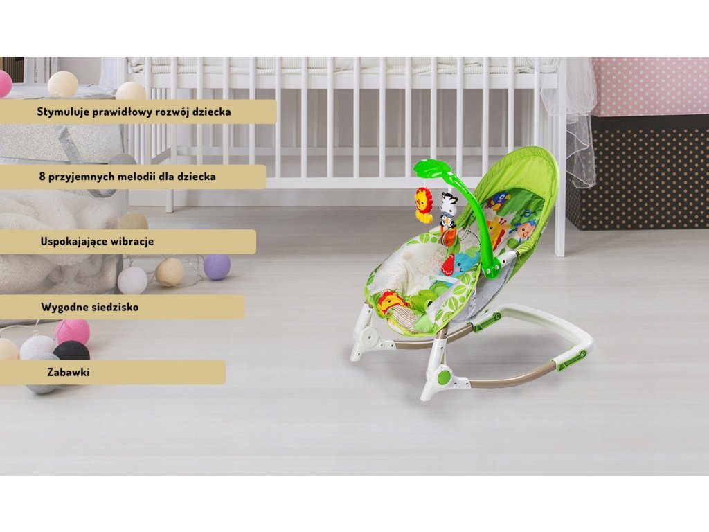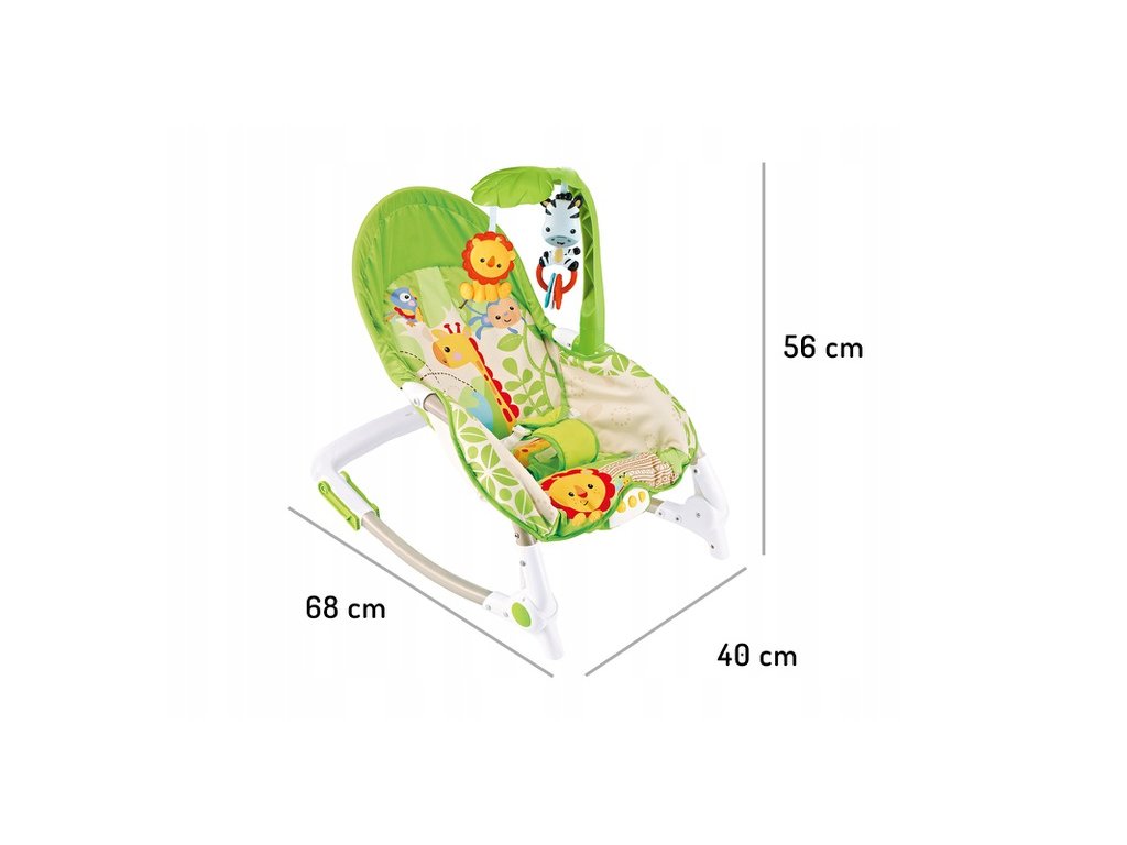 Hojdacie kreslo, ktoré pomôže vášmu dieťatku môže bezpečne odpočívať od prvých týždňov života hrať a hýbať sa. Umožní vám príjemne uspať vaše dieťatko. Kolíska je vybavená mäkkým, na dotyk príjemným matracom a tyč s 2 hračkami.