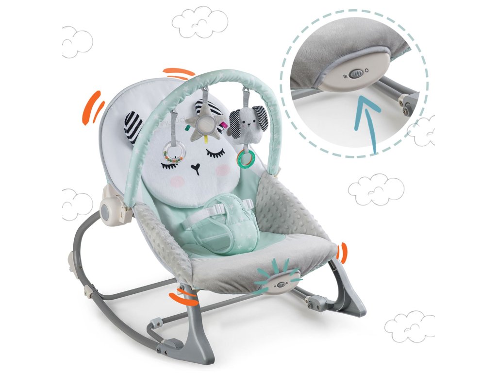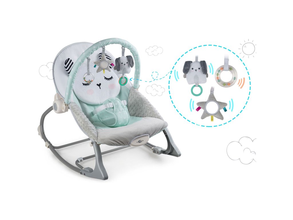 Lehátko je vybavené odnímateľnou čelenkou s pripojenými šuštiacimi hračkami.... Tie vaše dieťa zabavia, zatiaľ čo vy budete relaxovať. Tieto jedinečné hračky stimulovať videnie a rozvíjať hmat.