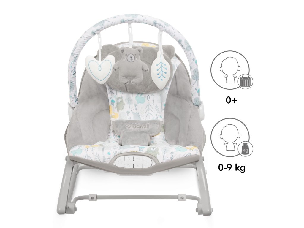 Výrobek je určen pro děti od prvních dnů života. Stabilní rámová konstrukce umožňuje bezpečné používání houpačky, dokud dítě nedosáhne hmotnosti 9 kg. Houpací lehátko Kidwell PINO má: