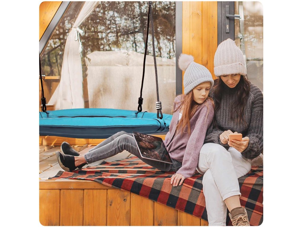 Hojdačka s oceľovým rámom pokryté mäkkou ochrannou penou, vyrobené z pevného materiálu s mnohonásobným prešívaním a na silných závesných lanách. Zaručuje bezpečnosť, stabilitu a odolnosť.