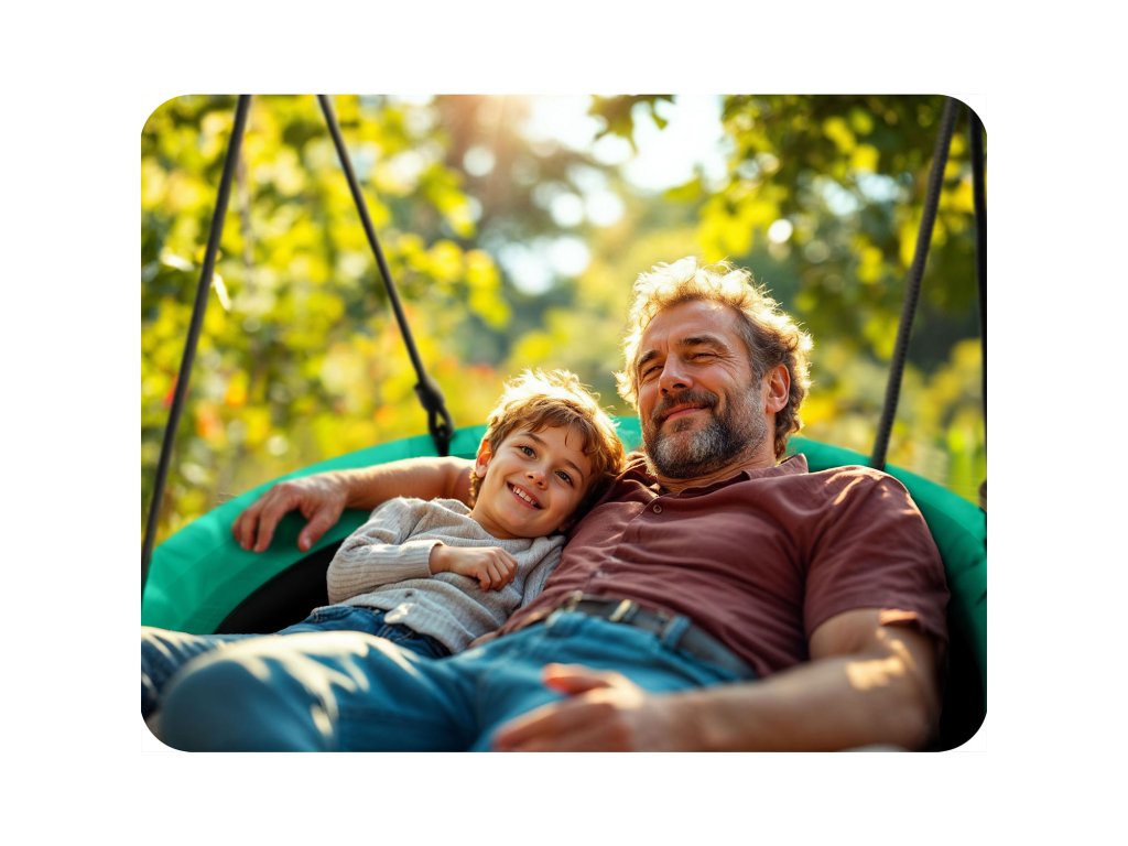 Houpačka s ocelovým rámem potažené měkkou ochrannou pěnou, vyrobené z pevného materiálu s několikanásobným prošitím a na silných závěsných lanech. Zaručuje bezpečnost, stabilitu a odolnost.