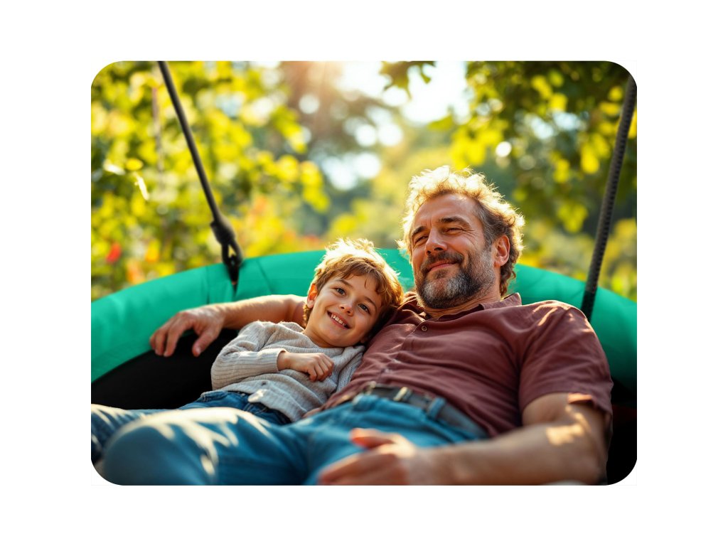 Houpačka s ocelovým rámem potažené měkkou ochrannou pěnou, vyrobené z pevného materiálu s několikanásobným prošitím a na silných závěsných lanech. Zaručuje bezpečnost, stabilitu a odolnost.
