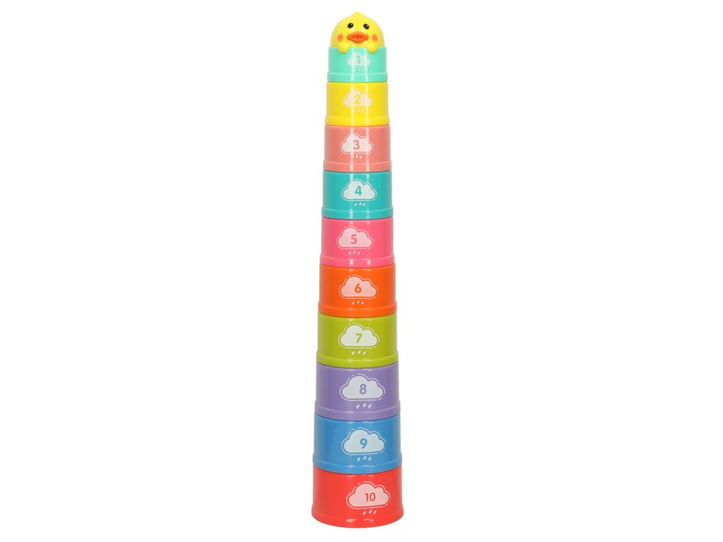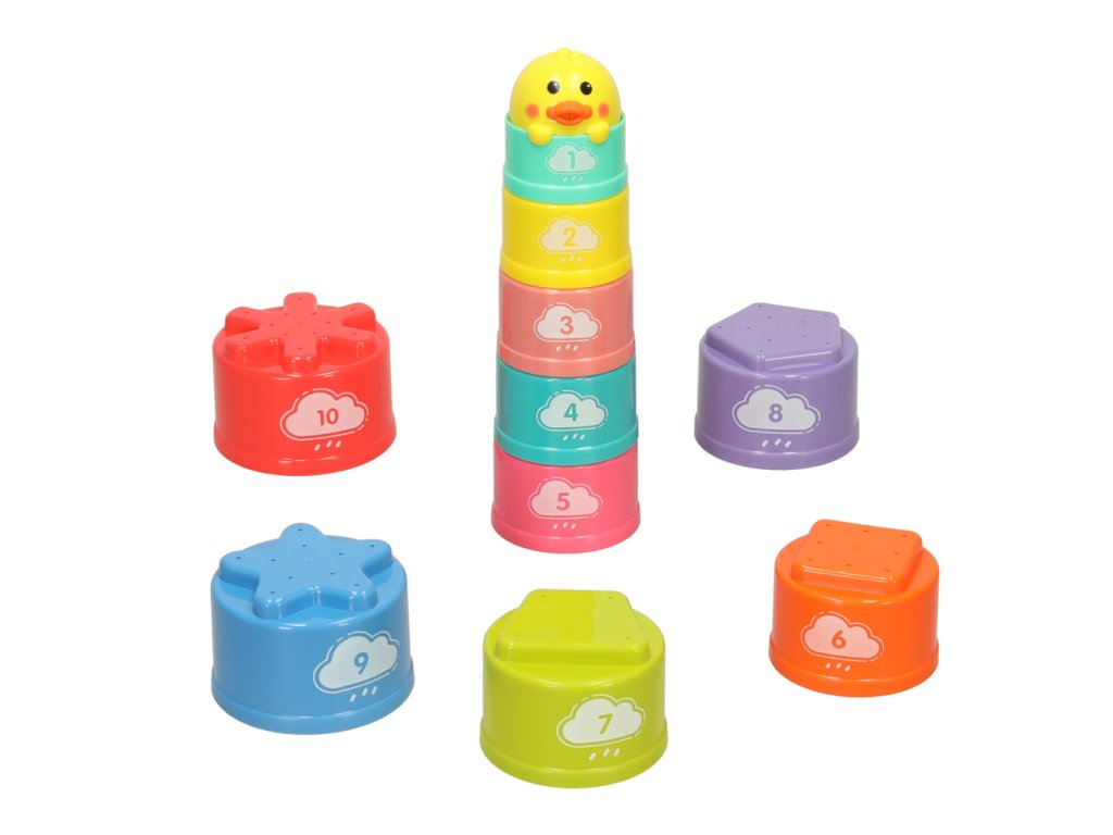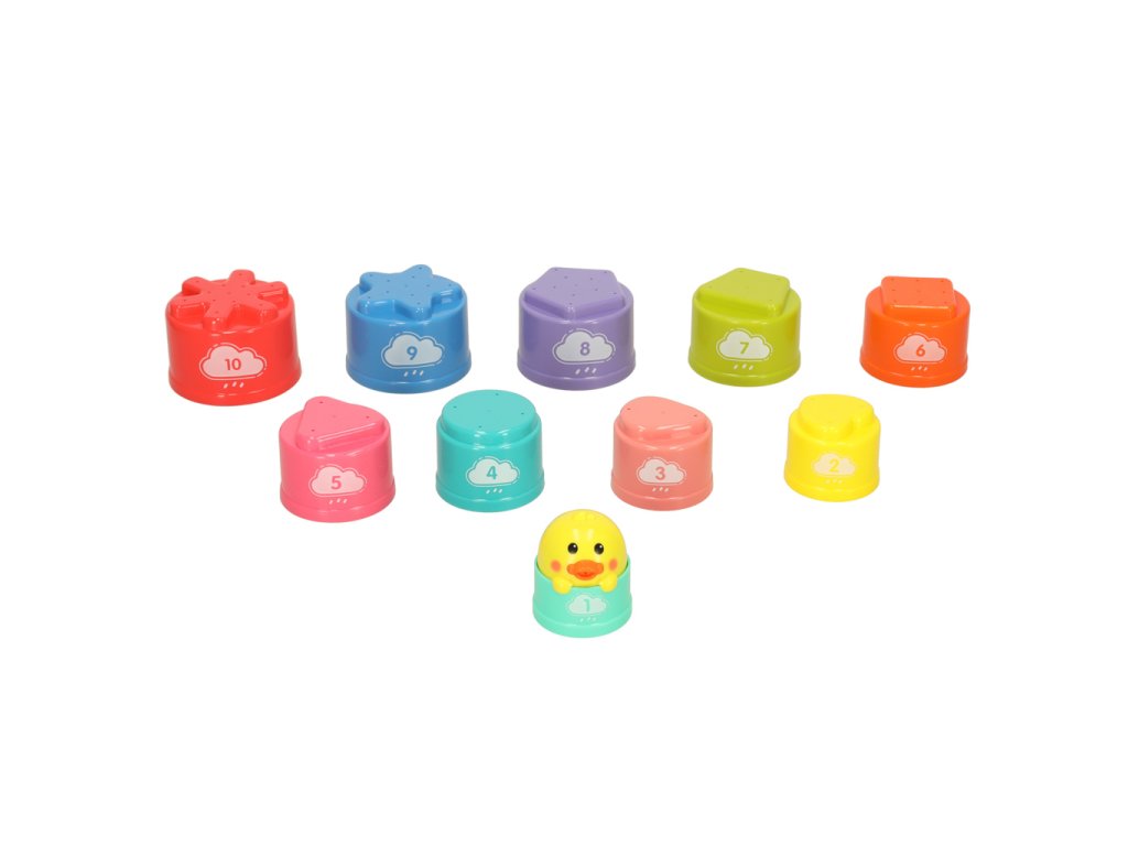Každý šálek liší se velikostí a tvarem základny což podněcuje zvědavost dítěte a podporuje experimentování. Šálky mohou být postaveny nad sebou a vytvořit věž. Stavění rozvíjí přesnost pohybu, koordinaci rukou a očí a logické myšlení.