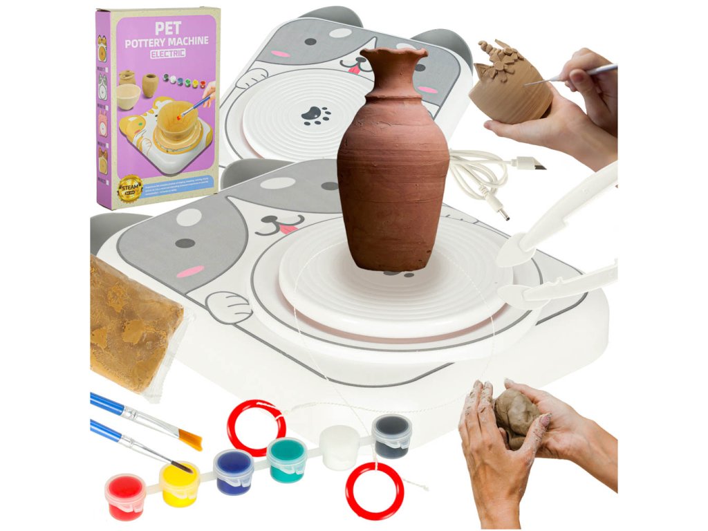 - Hrnčířský kruh na stabilním stojanu s motivem psa- Napájení: USB kabel (100 cm v balení)- Barvy (6 barev): červená, žlutá, modrá, zelená, bílá, černá- Štětce (2 ks)- Špachtle a modelovací hroty (4 hroty)- Měkká hrnčířská hlína- Provaz pro přesné ořezávání hrnce- Ochranná zástěra- Návod k použití