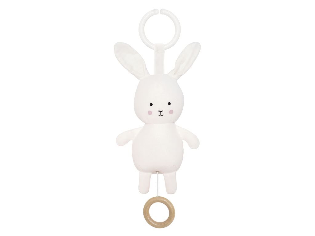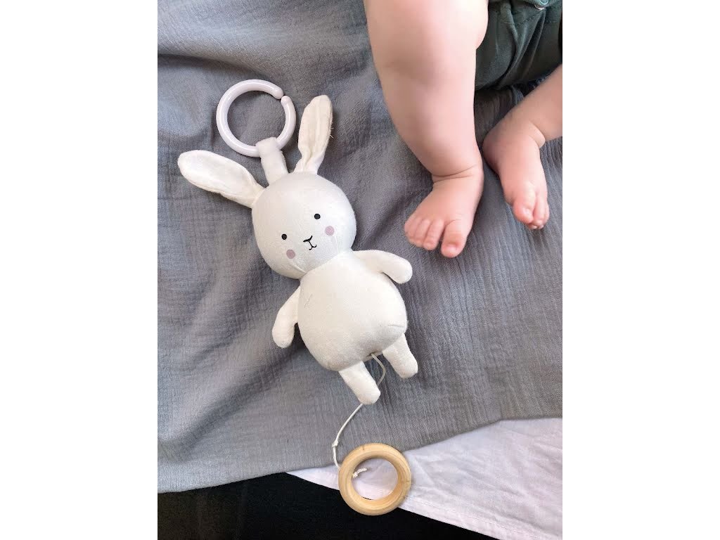 Roztomilá hudební hračka ve tvaru zajíčka k zavěšení do kočárku. Umožněte svému dítěti usnout s uklidňující melodií. Chcete-li aktivovat hudební funkci, zatáhněte za závěsný dřevěný kroužek a hračka začne hrát ukolébavku. Hudební skříňku lze snadno připevnit a funguje téměř kdekoli. Vyrobeno z nejjemnějšího mušelínu a výplně z polyesterových vláken.