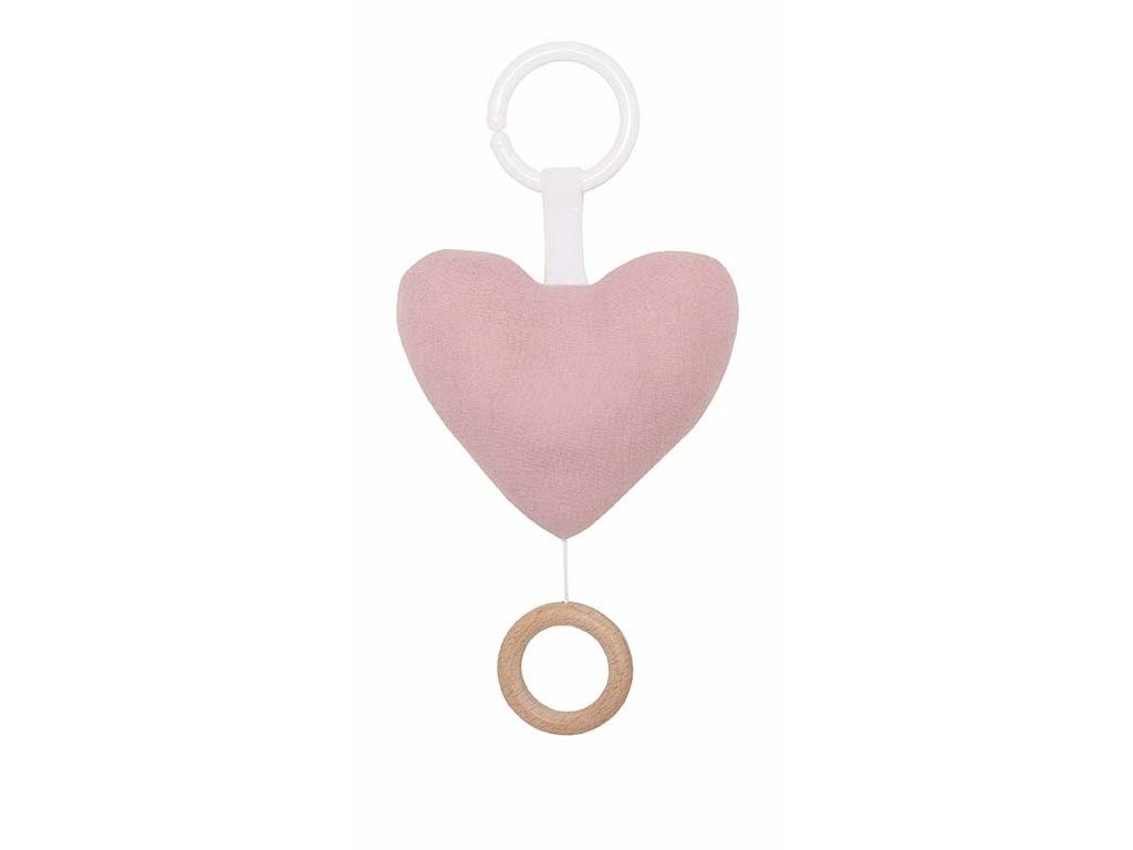 Roztomilá hrací skříňka ve tvaru srdce k zavěšení do kočárku. Umožněte svému dítěti usnout s uklidňující melodií. Chcete-li aktivovat hudební funkci, zatáhněte za výklopný dřevěný kroužek a hračka začne hrát ukolébavku. Hudební box se snadno připevňuje a funguje téměř kdekoli. Vyrobeno z nejjemnějšího mušelínu a výplně z polyesterových vláken.