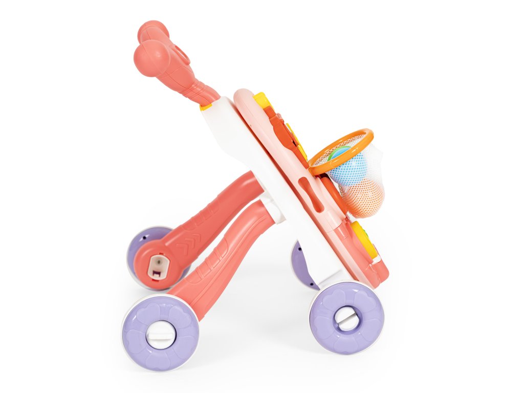 Jeho konstrukce je vyrobena z je vyroben z odolného plastu a navržen tak, aby byl bezpečný a stabilní, zejména pro nejmenší děti, které začínají dělat první krůčky. Kočárek je ideální "pomocník" a poskytuje dítěti pohodlnou oporu , široce rozkročená kola zajišťují stabilitu a dostatečný prostor (27 cm) pro volný krok. Kola mají speciální pryžový běhoun, který zabraňuje sklouznutí jezdce a chrání podlahu před poškrábáním. Rukojeť je dvoustupňově nastavitelná, stačí uvolnit zajišťovací mechanismus a zvednout ji nahoru její výšku lze nastavit podle výšky dítěte.