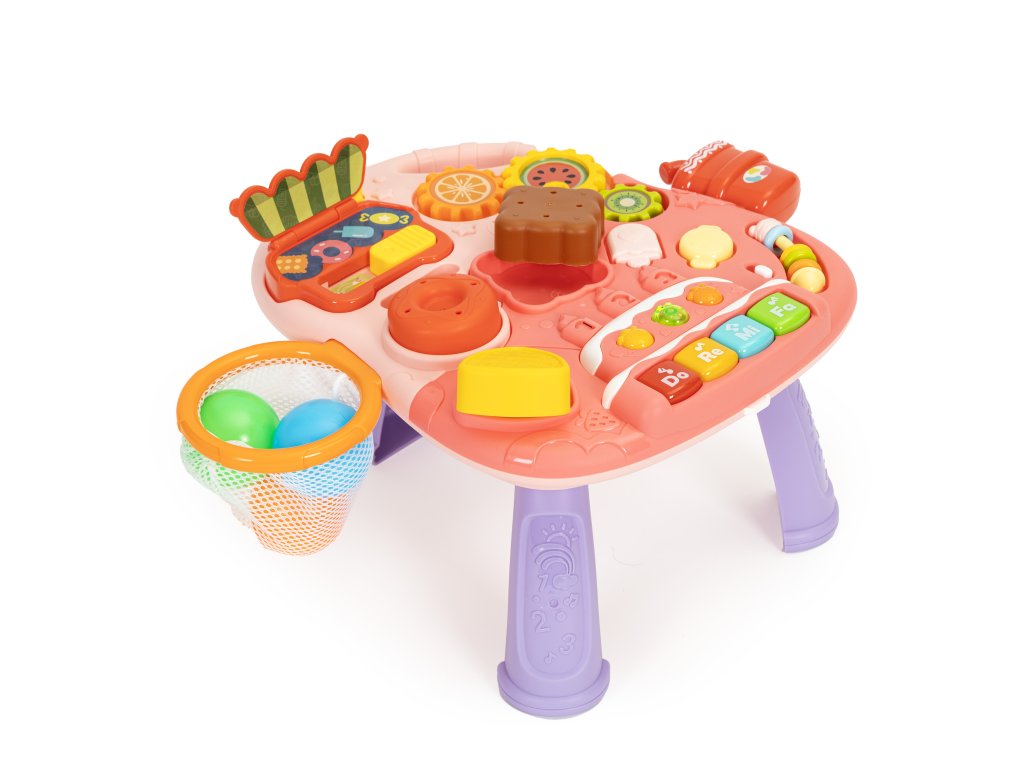 Stůl se skládá z předního posuvného panelu a 3 nohou, které jsou součástí sady, díky možnosti odpojení dítěte můžete ji používat jako samostatnou hračku nebo proměnit ve funkční stůl plný zábavných prvků.