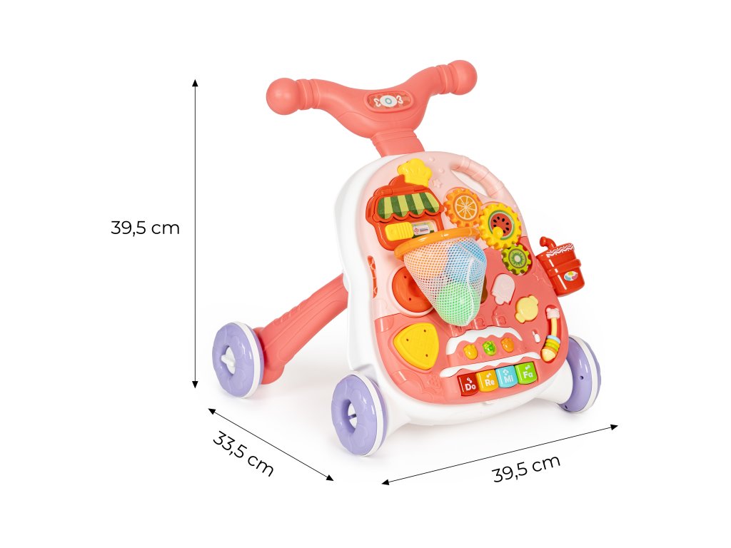 Stačí odpojit panel na přední straně kočárku, vložit do něj nohy a můžete začít používat funkční stolek, který má spousta pohyblivých částí. Zajímavým doplňkem je malý klavír, který přehrává zvuky a melodie, se jistě rychle stane oblíbenou hračkou, takže je to skvělá zábava pro každé dítě.
