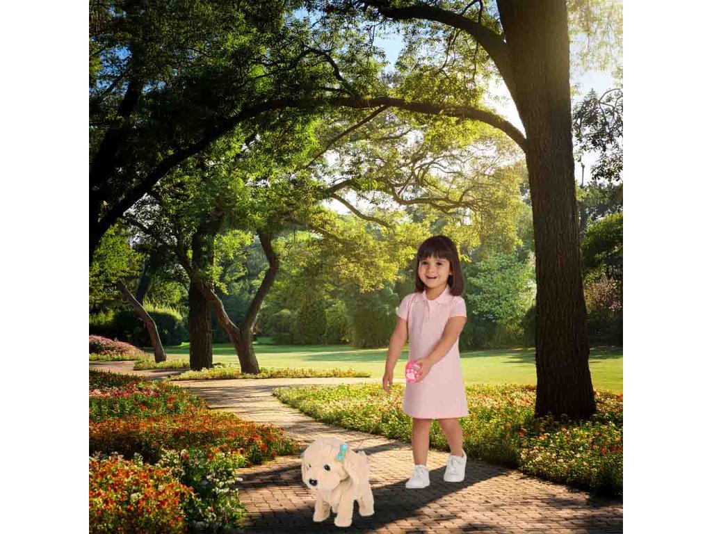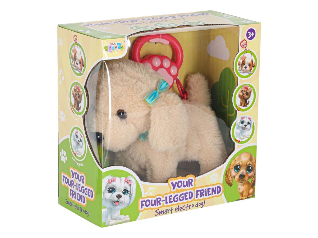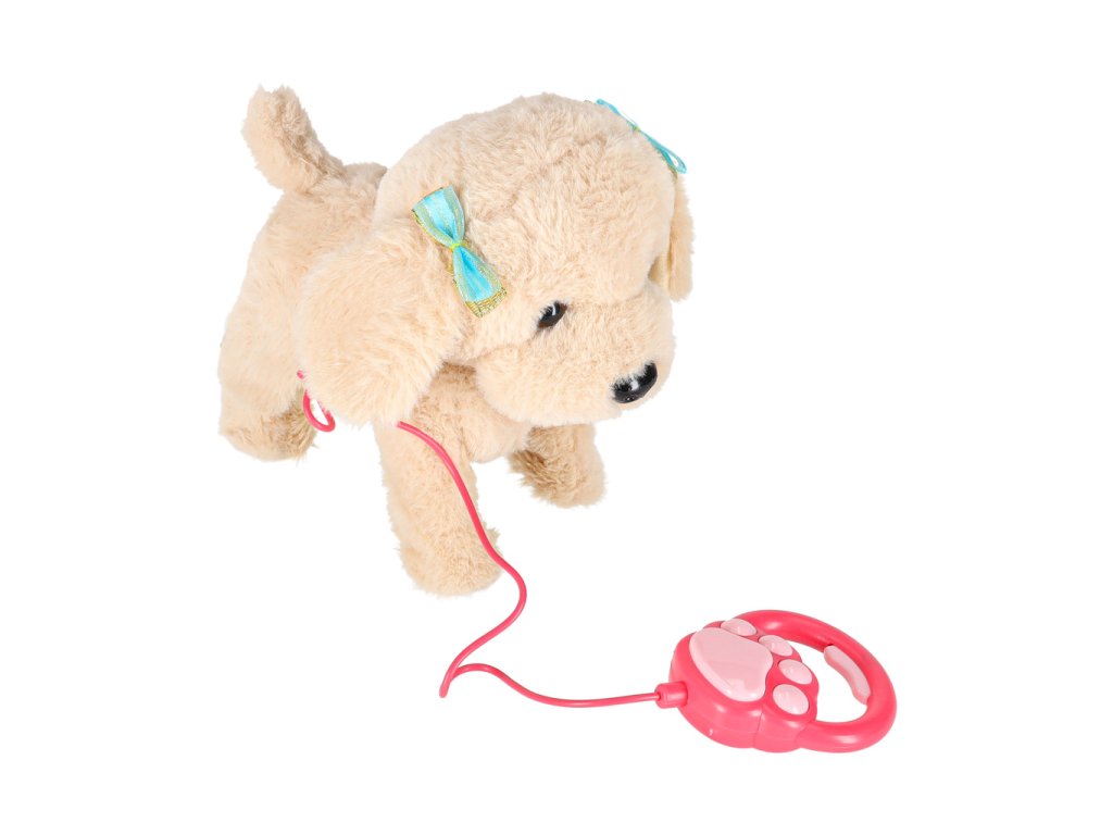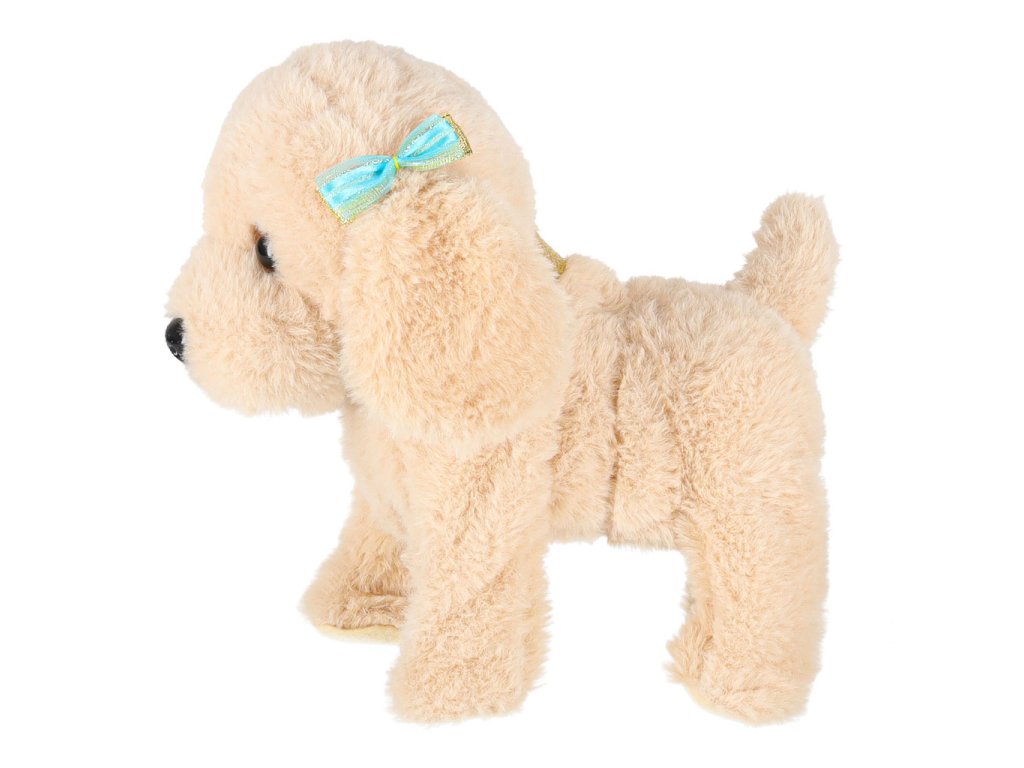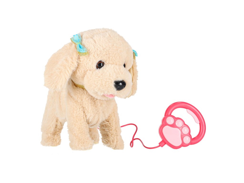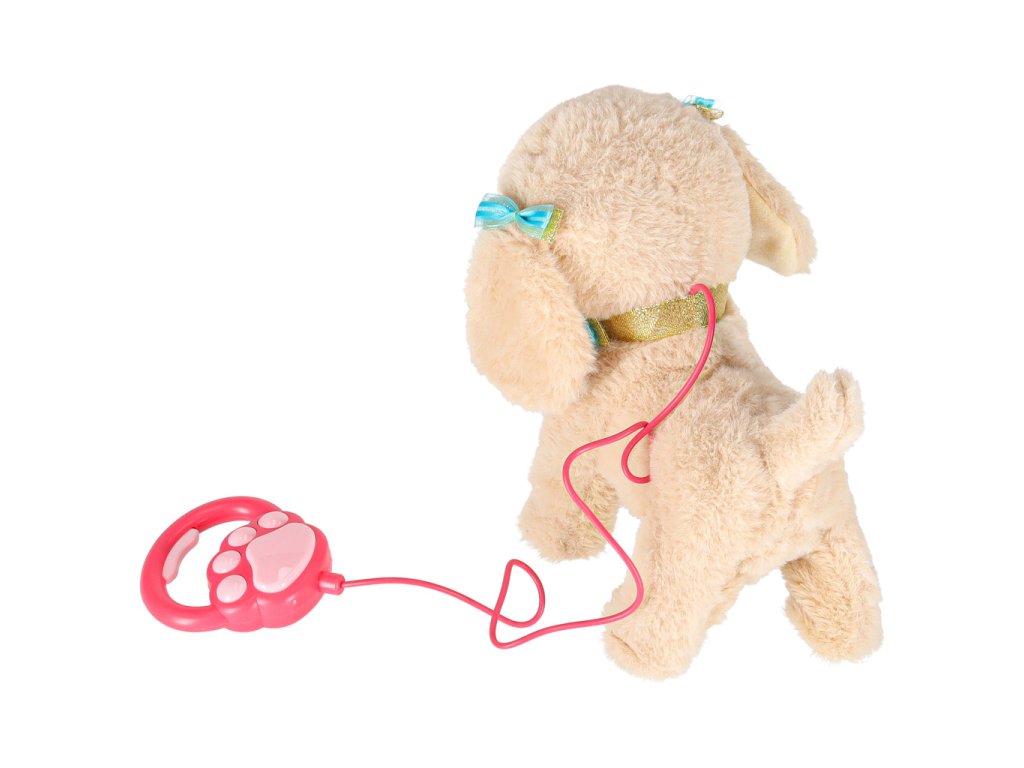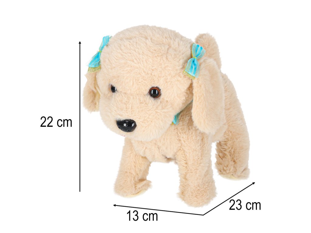 Technické specifikace: - Věk uživatele: - Barva : béžový pes, modré a zlaté doplňky, růžové vodítko- Plemeno: pudl - Materiál: plyšové, plastové Napájení : 3x baterie AA (nejsou součástí dodávky) - Délka vodítka: 1,5 mm: 65 cm- Funkce : chůze, štěkot / "zpěv", kývání hlavou, vrtění ocasem - Hmotnost psa : 0,35 kg- Hmotnost hračky včetně obalu : 0,55 kg Rozměry psa : - Výška: 22 cm - Šířka: 13 cm - Délka (od nosu k ocasu): 23 cm - Výrobek je zabalen v estetické barevné kartonové krabici s okénkem s rozměry: 27 x 26,5 x 12,5 cm