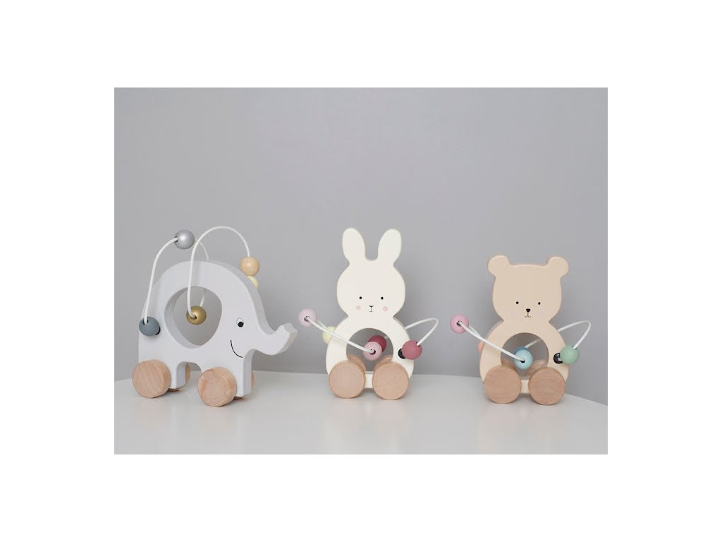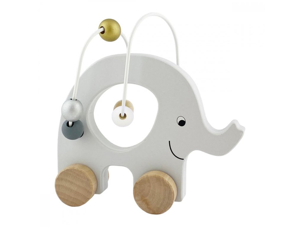 Zvíře z masivního dřeva ve tvaru slona. Díky kolečkům v podobě nohou se zvířátko snadno kutálí po kobercích a kdekoli v domácnosti. Slon má kolem těla také počítadlo s 5 kuličkami v různých barvách. Ideální dárek k 1 roku.