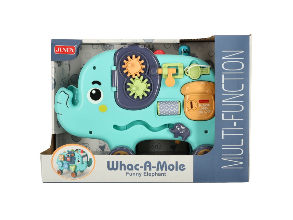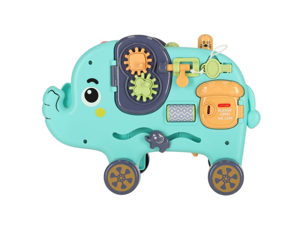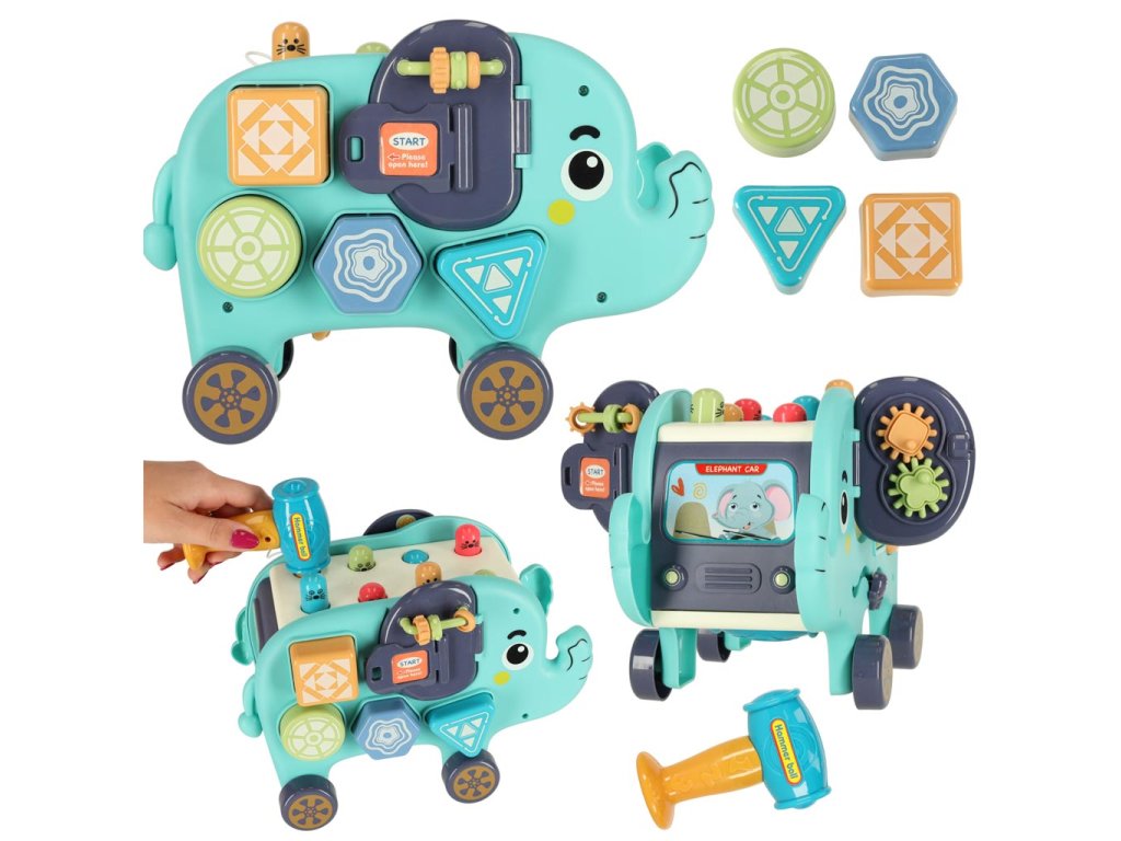 Interaktivní Montessori slon - skvělá hračka pro každé dítě! Rozvíjí intelekt a motoriku. Obsahuje třídičku, kladívko a manipulační desku. Perfektní dárek!
