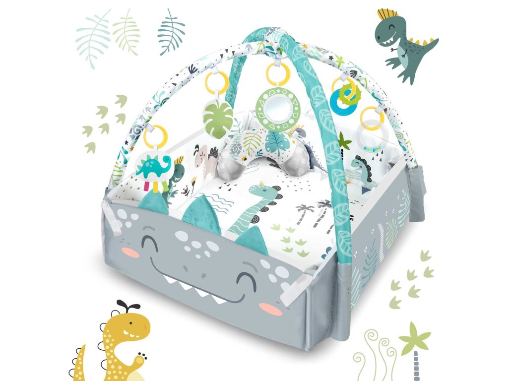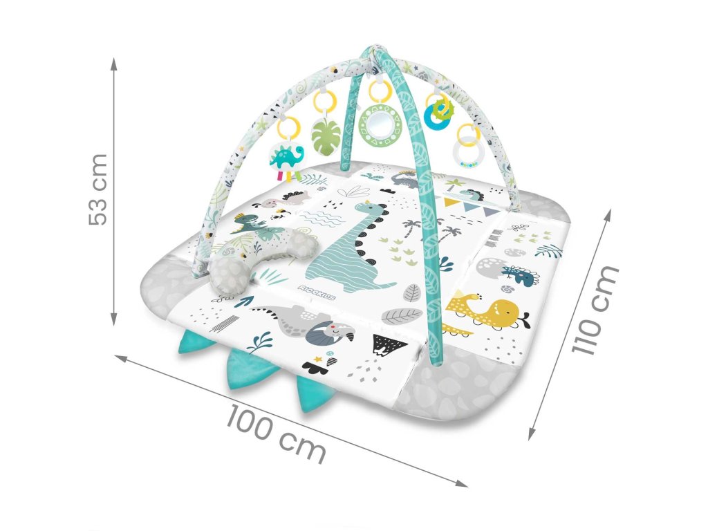 Preto sme do balenia zahrnuli multifunkčné hračky, ktoré sa dajú zavesiť na podložku - hrkanie alebo šuštenie upúta pozornosť a zvedavosť dieťaťa. K dispozícii je aj pískacia hračka - dinosaurus s hmatovo stimulujúcimi stuhami!