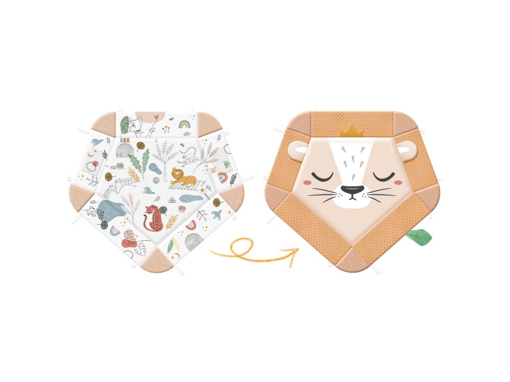 Zadná strana vankúša je vyrobená z tkaniny v štýle minky, je jedinečná mäkké a príjemné. Vankúš môže byť pripevniť hračky. Levie uši šuštia!