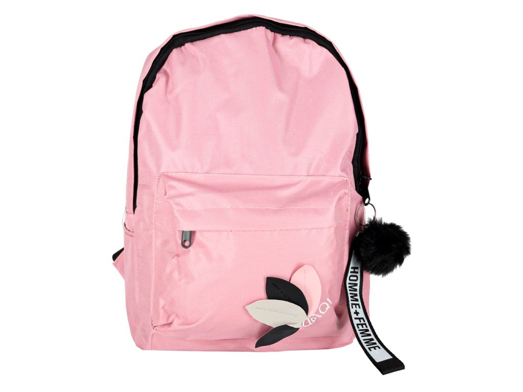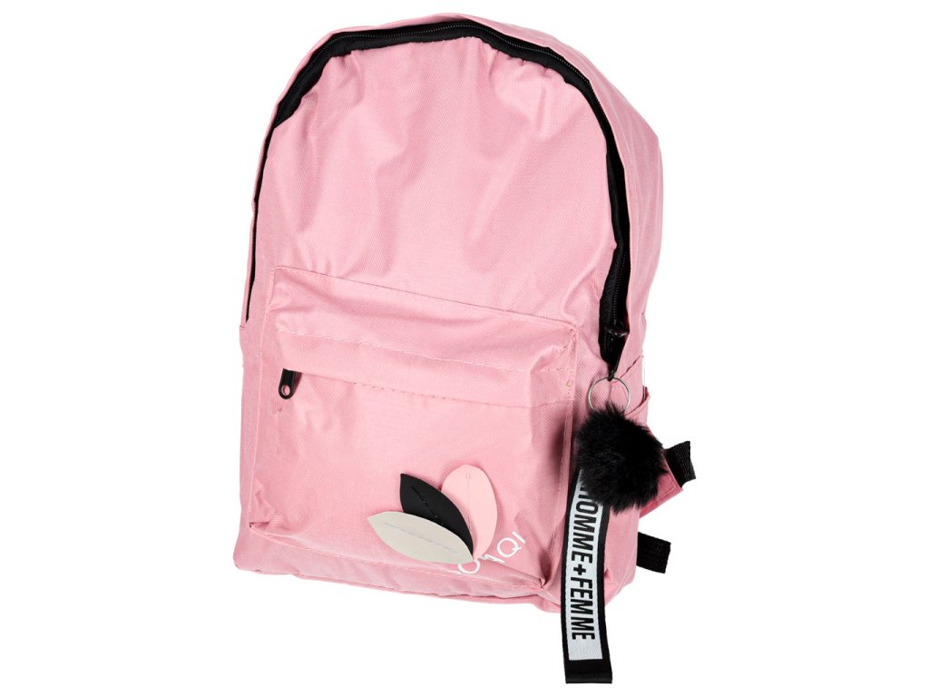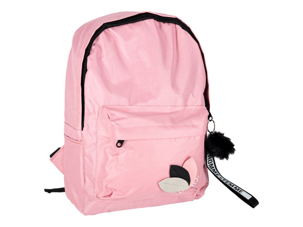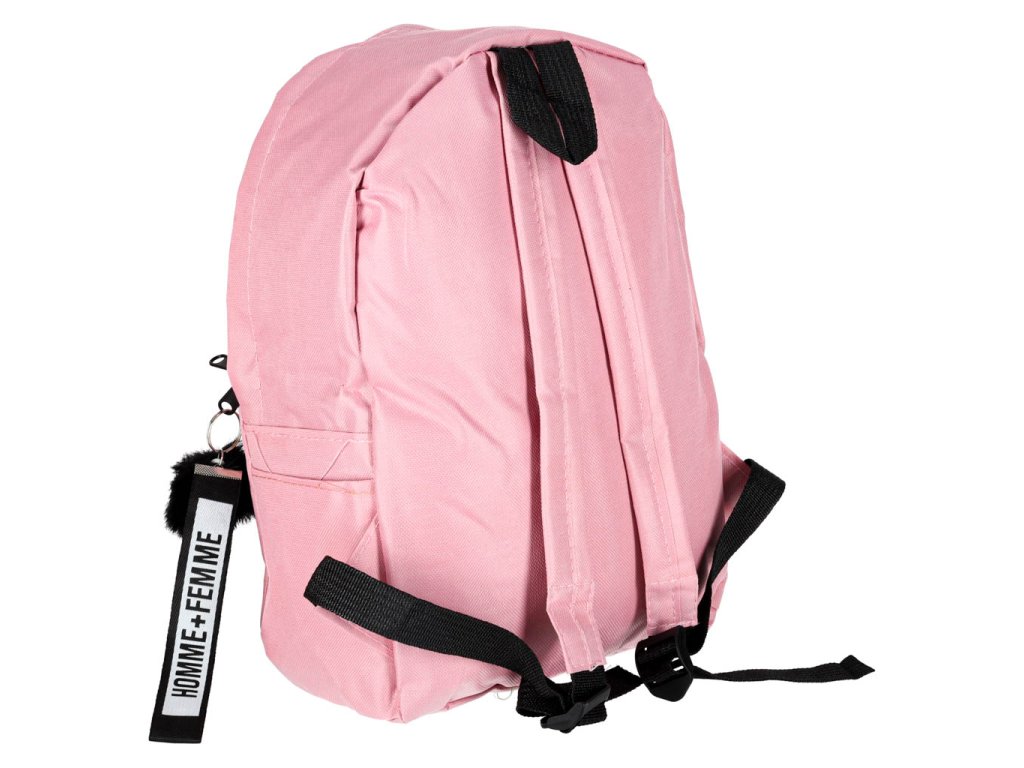 Moderní růžový školní batoh s přívěskem a bambulí. Vyroben z kvalitního polyesteru Oxford 600D. Má praktické kapsy, pohodlné popruhy a pevné zipy. Ideální pro studenty. Hmotnost 0,2 kg.