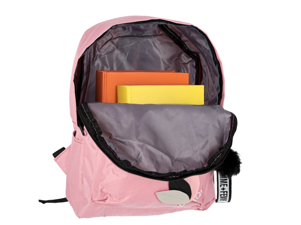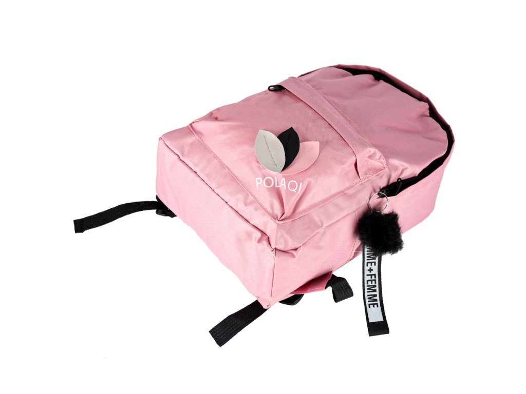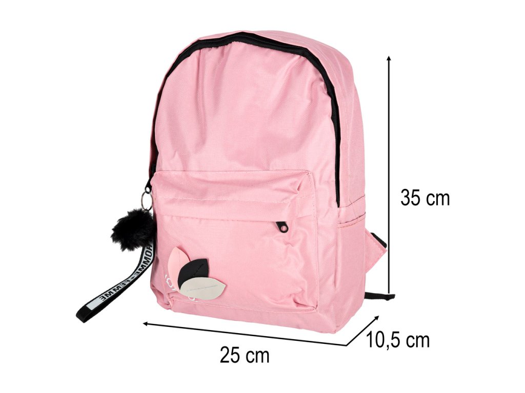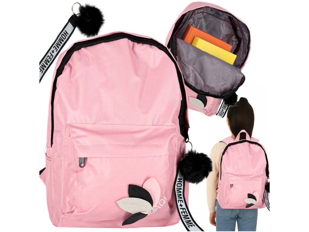 Moderní růžový školní batoh s přívěskem a bambulí. Vyroben z kvalitního polyesteru Oxford 600D. Má praktické kapsy, pohodlné popruhy a pevné zipy. Ideální pro studenty. Hmotnost 0,2 kg.