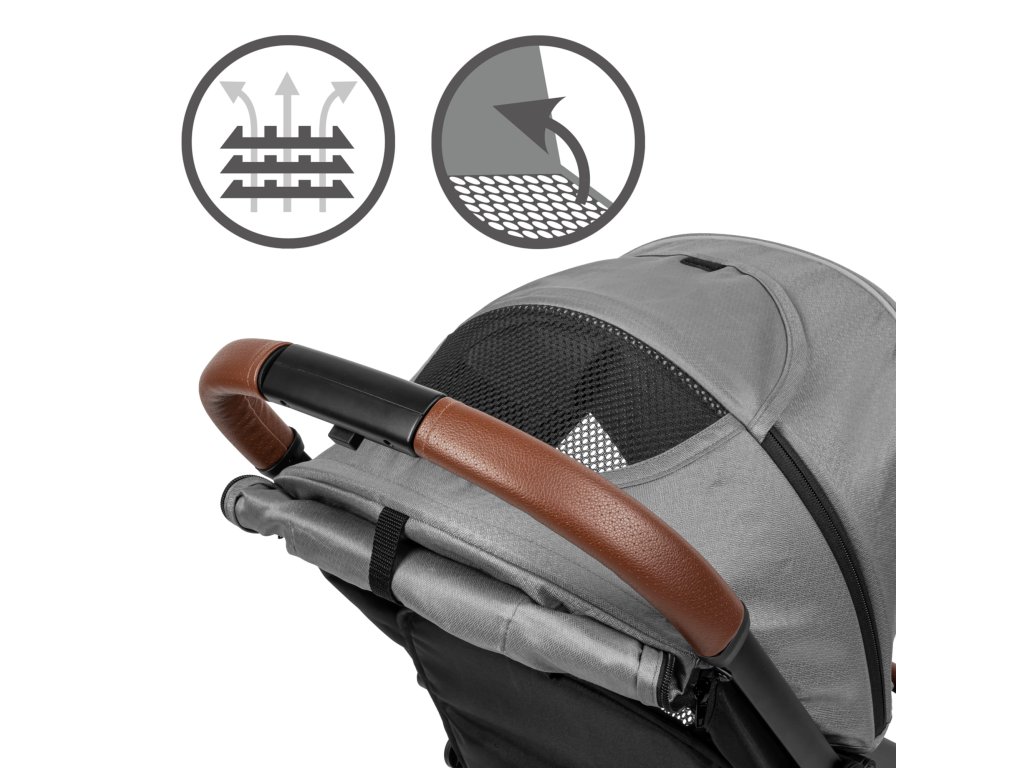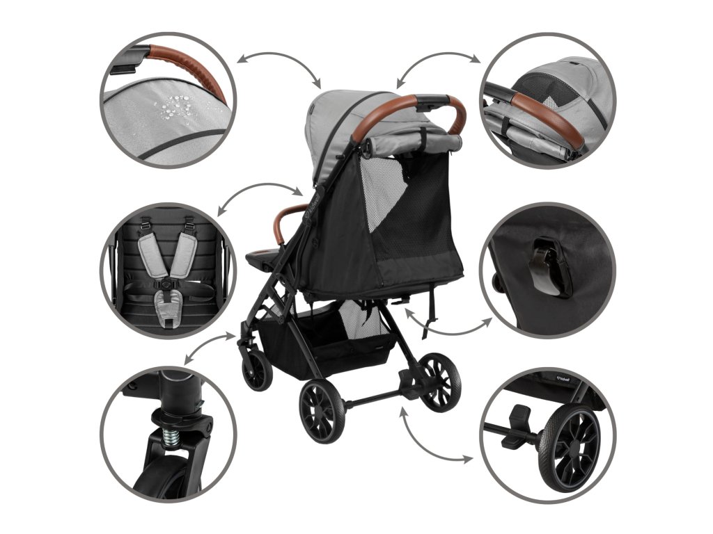 nosnost až 22 kg + 2 kg v koši3 úrovně nastavení opěradlaprostorný košzvětšovací stříška s okénkem2 úrovně nastavení opěrky nohou5bodové bezpečnostní pásylehká konstrukce, pouze 7,9 kgvoděodolný materiálodnímatelná čelenkabezúdržbová kolečka z pěnové pryže - 6" a 8"tlumení nárazů předních a zadních kolkapsa na zadní straně kapucereflexní prvek na kapotěrukojeť a čelenka z ekokůžeSada obsahuje chránič nohou s praktickým zipemnožní brzdaVýhody kočárku: