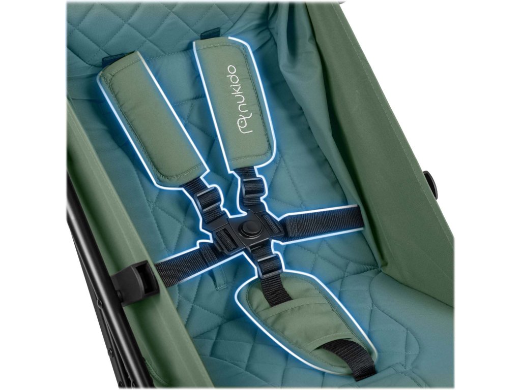 ✔Pětibodové bezpečnostní pásy s polštáři. Tento systém bezpečnostních pásů poskytuje optimální ochranu dítěte v kočárku.