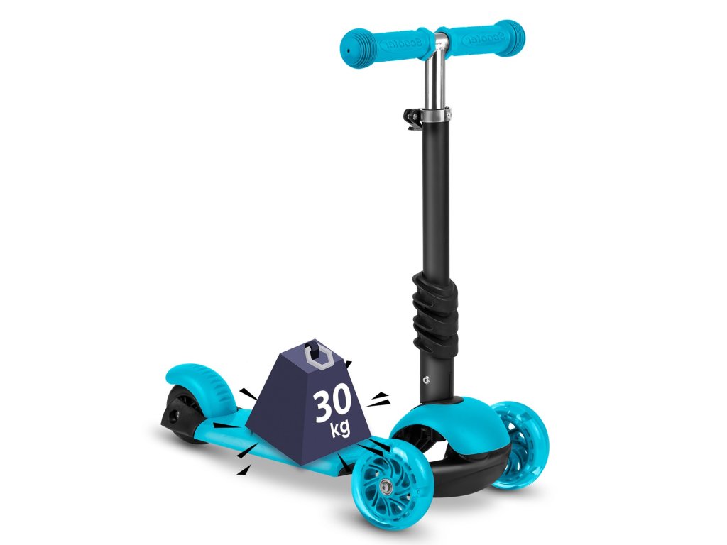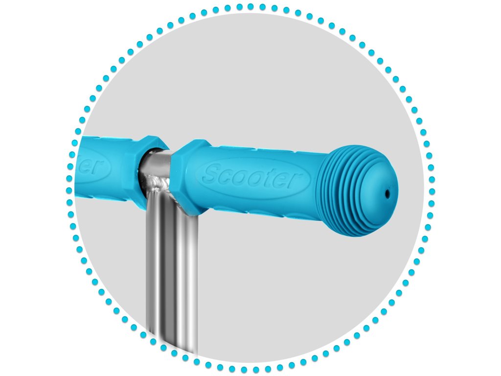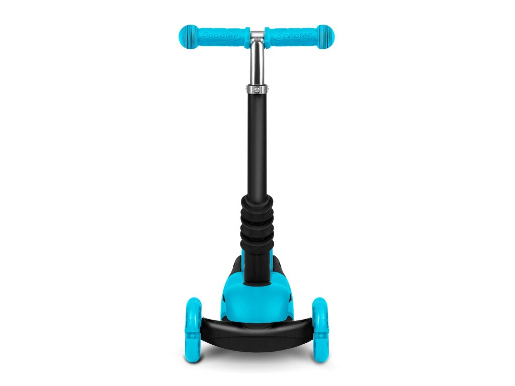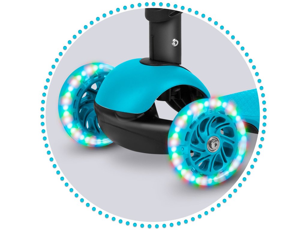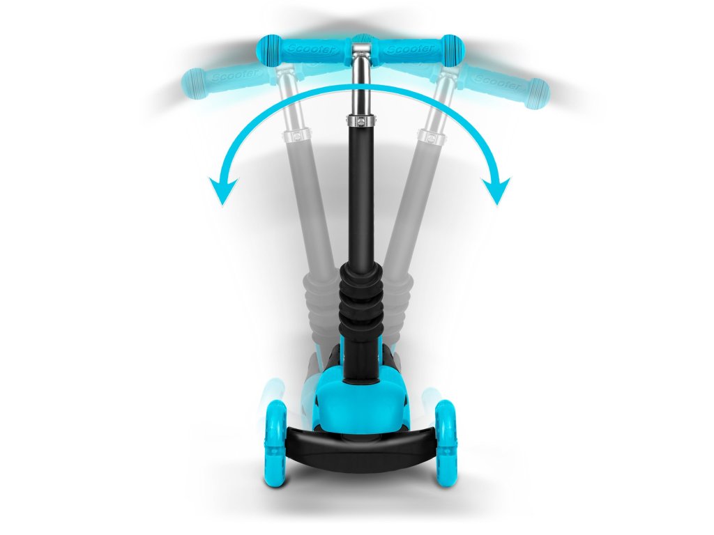 Řízení se provádí výhradněprostřednictvím rovnováhy těla, bez otáčení volantem. Stačí mírně naklonit volant požadovaným směrem - a je to! Vaše dítě si tuto techniku řízení rychle osvojí aprocvičujte svůj smysl pro rovnováhu. Koloběžka zůstává při zatáčení stabilně vzpřímená díky třem kolečkům.