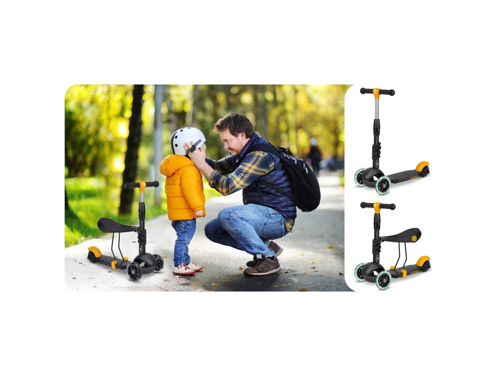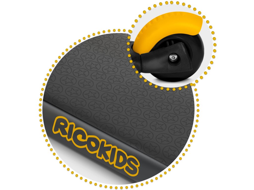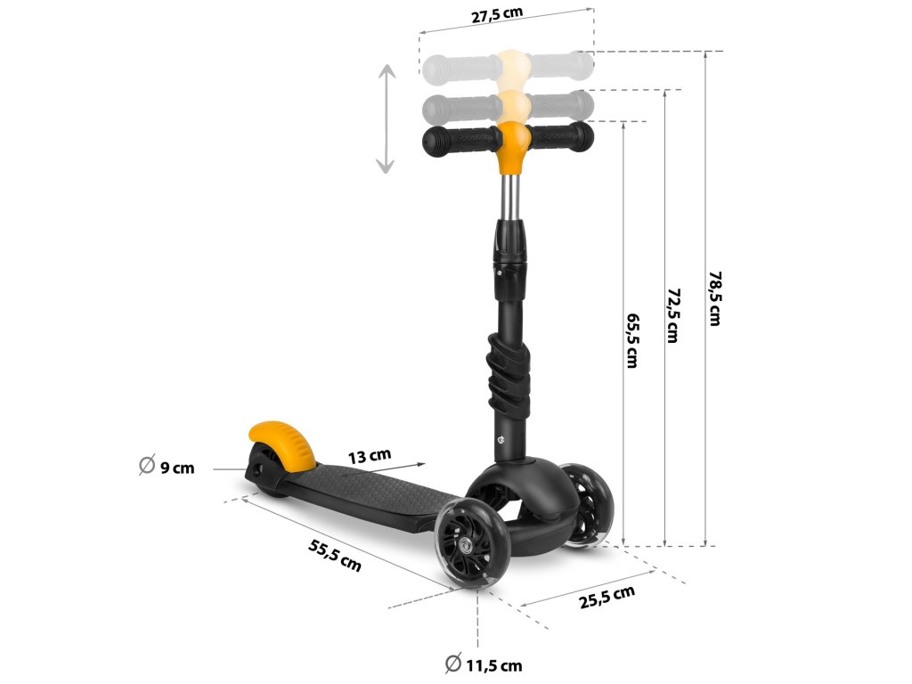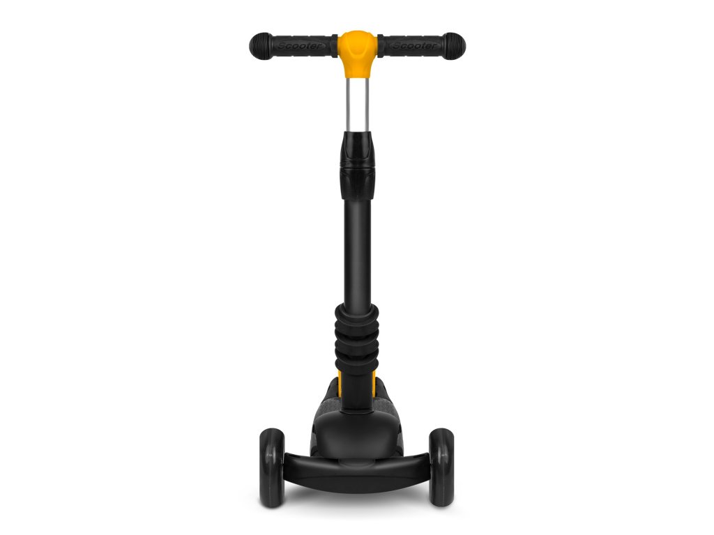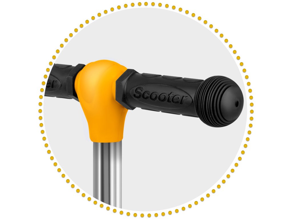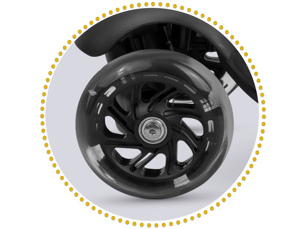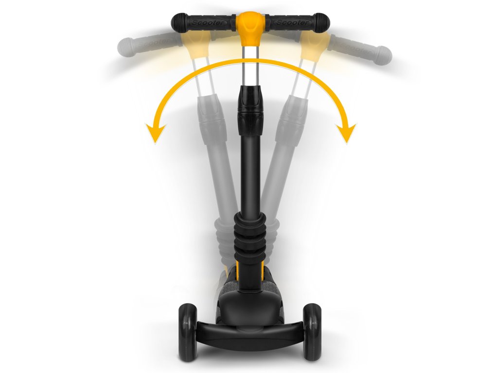 Řízení se provádí výhradněprostřednictvím rovnováhy těla, bez otáčení volantem. Stačí mírně naklonit volant požadovaným směrem - a je to! Vaše dítě si tuto techniku řízení rychle osvojí aprocvičujte svůj smysl pro rovnováhu. Koloběžka zůstává při zatáčení stabilně vzpřímená díky třem kolečkům.