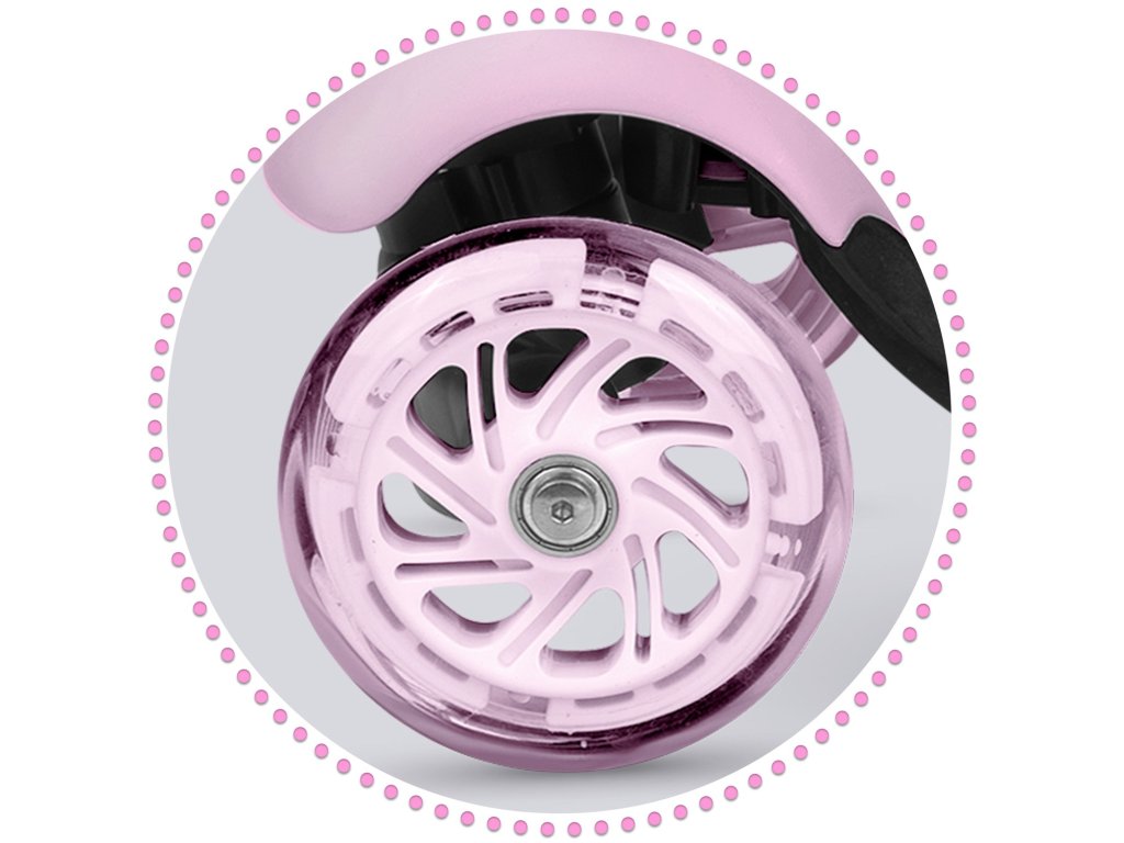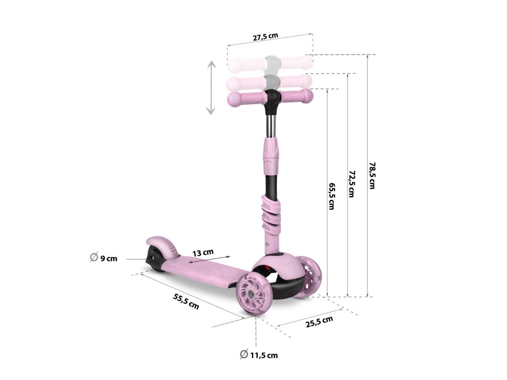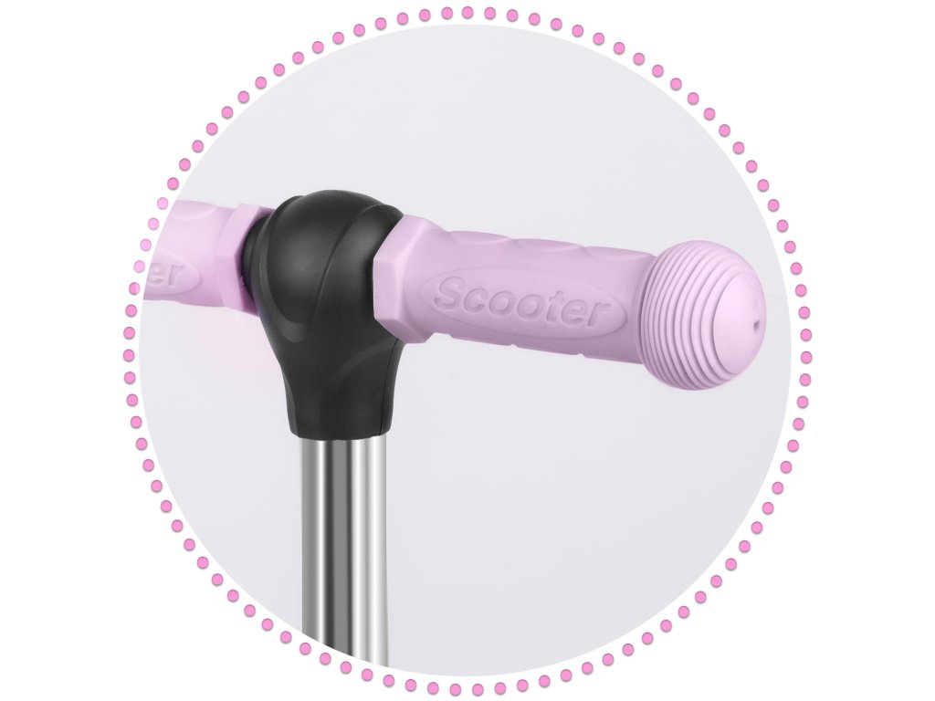 Řízení se provádí výhradněprostřednictvím rovnováhy těla, bez otáčení volantem. Stačí mírně naklonit volant požadovaným směrem - a je to! Vaše dítě si tuto techniku řízení rychle osvojí aprocvičujte svůj smysl pro rovnováhu. Koloběžka zůstává při zatáčení stabilně vzpřímená díky třem kolečkům.