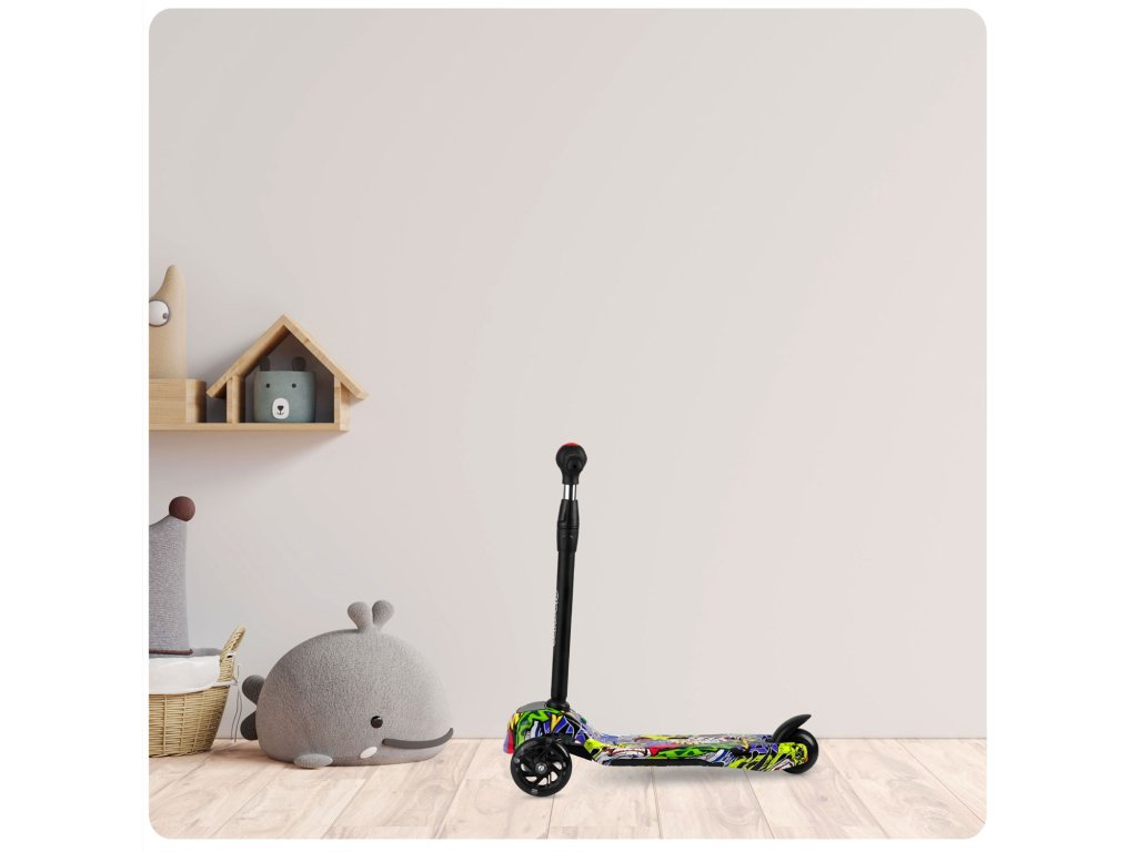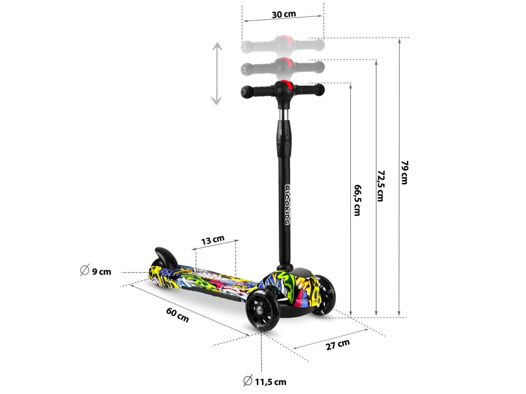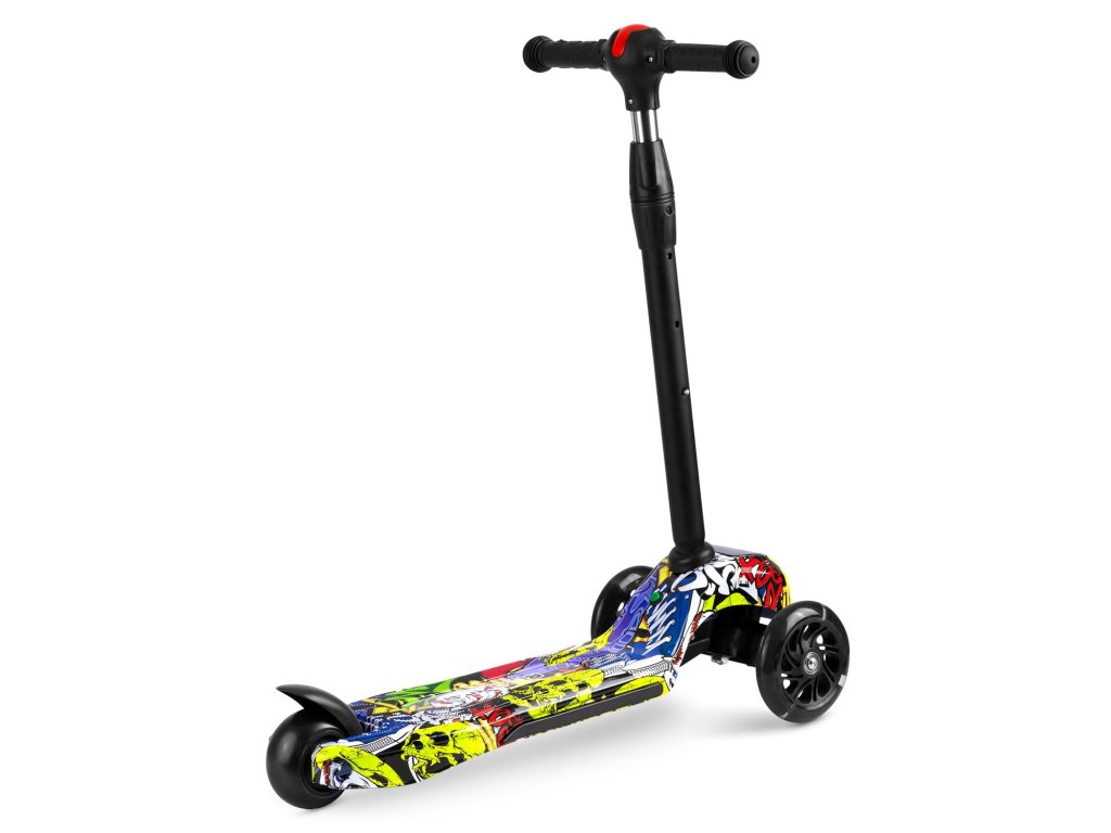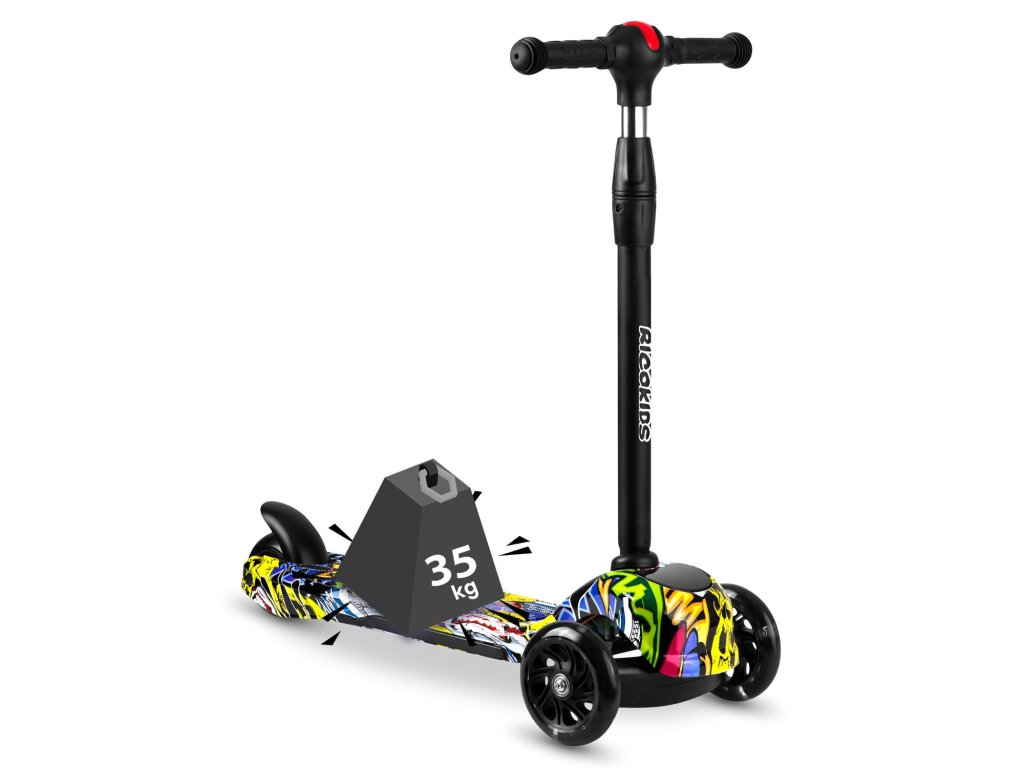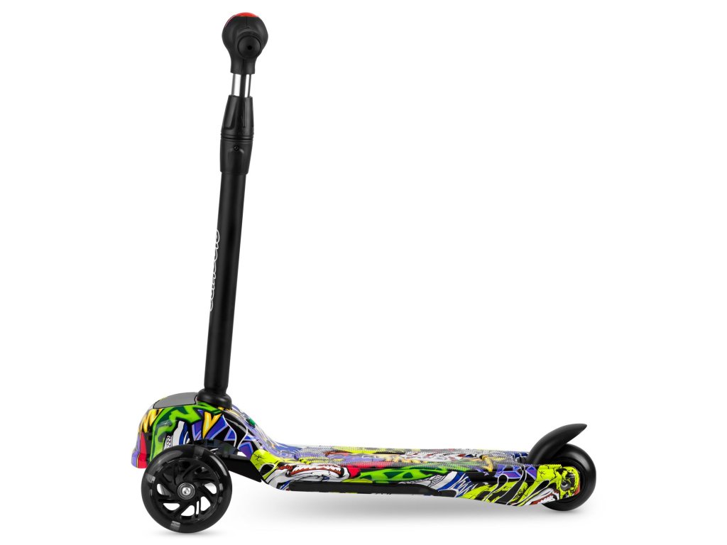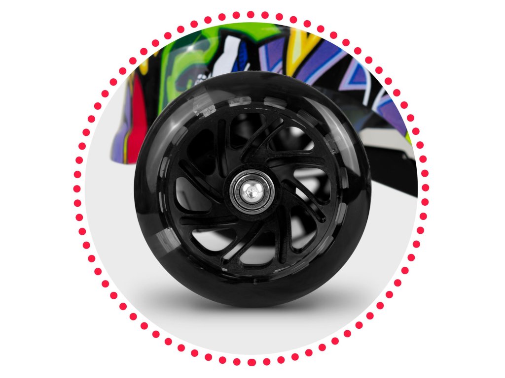 Tento skútr umožňuje říditprostřednictvím rovnováhy těla, bez otáčení volantem. Stačí naklonit volant požadovaným směrem - a je to. Vaše dítě si rychle osvojí tuto techniku řízení a zároveňprocvičujte svůj smysl pro rovnováhu. Je to také zařízeníbezpečnější pro menší děti - koloběžka se díky třem kolečkům udrží ve vzpřímené poloze.