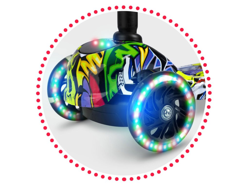 - skvělá zábava! Koloběžka má vestavěné dynamo, díky němuž je schopna kola se za jízdy rozsvítí!