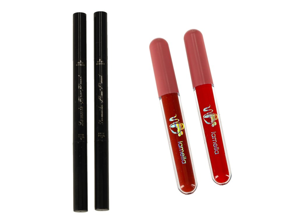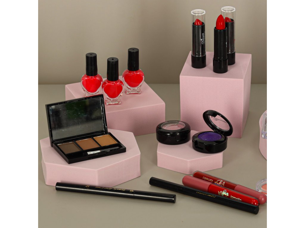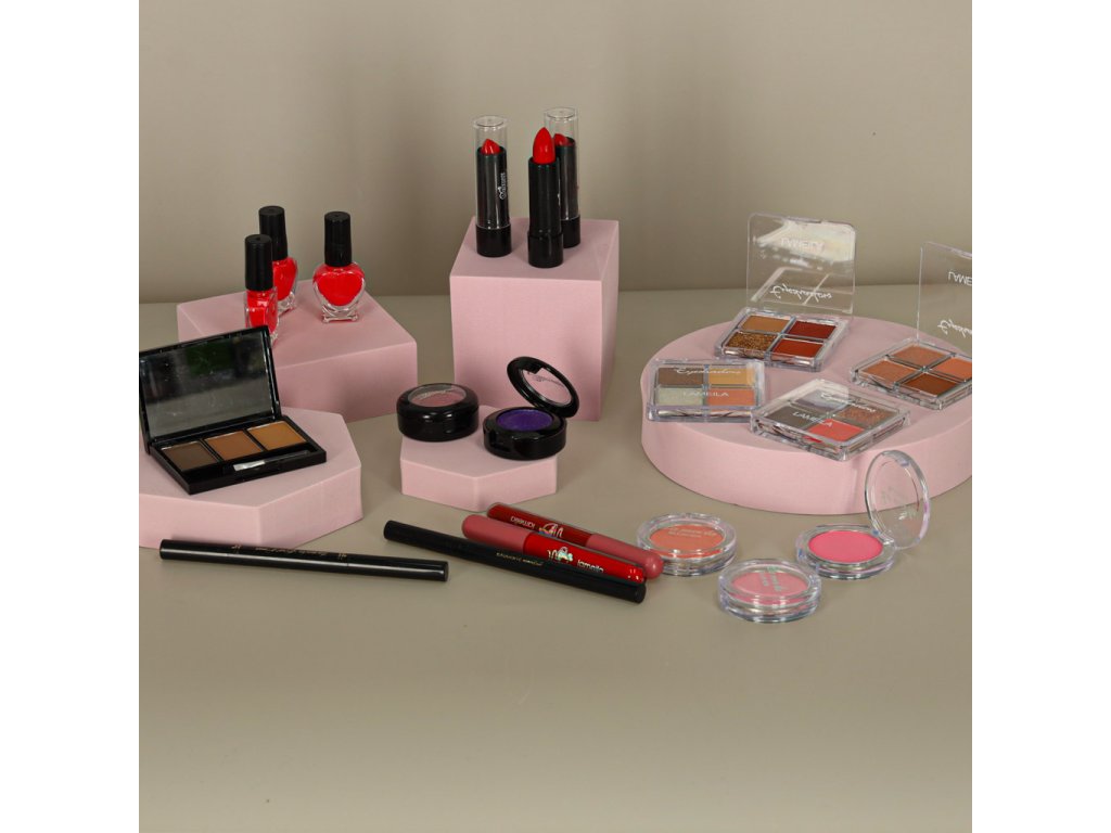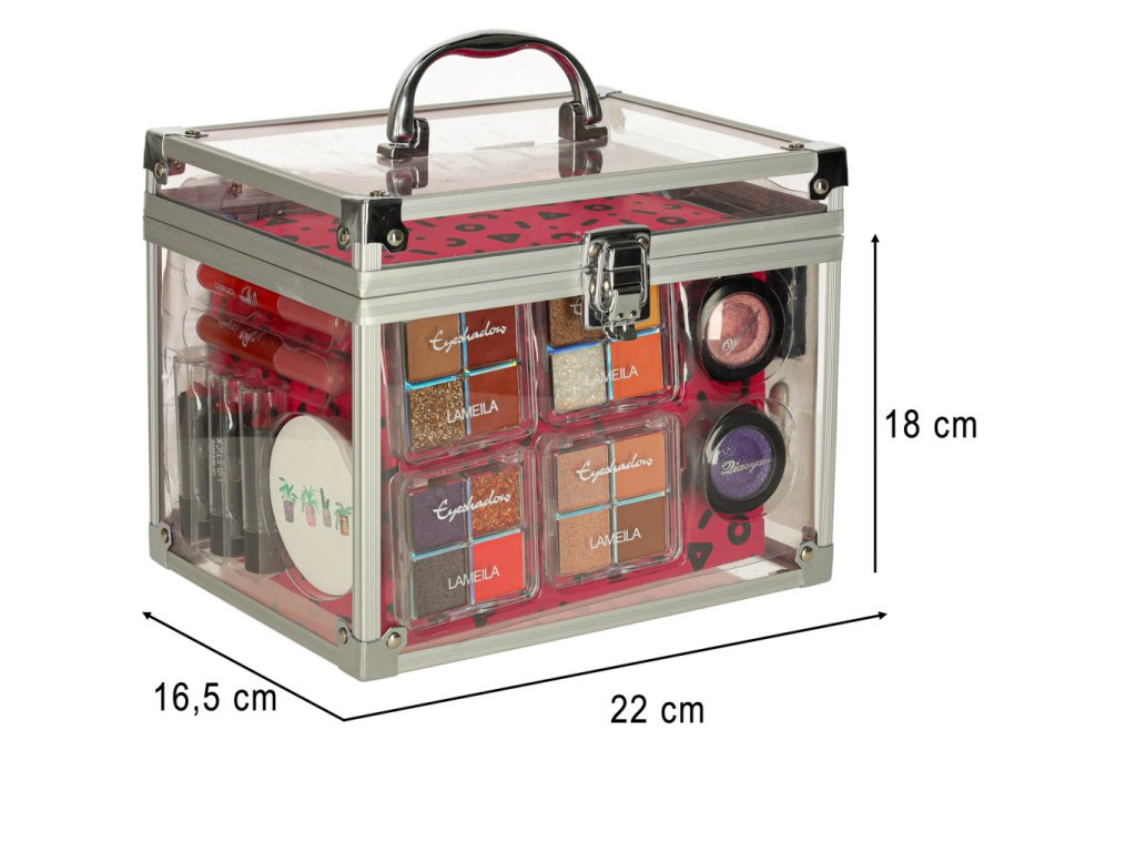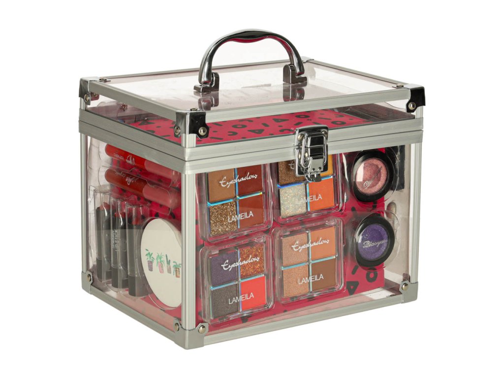 - Kosmetický kufřík - průhledný, s rukojetí a hliníkovým povrchem- 3 × rtěnky- 2 × tekuté rtěnky- 4 × paletky stínů (matné, saténové, lesklé)- 2 × stíny v sadě s houbičkou a zrcátkem- Pomády na obočí (3 barvy) + štěteček- Houbička na stíny- 3 × rtěnky- 2 × tužky na obočí- 3 × laky na nehty- Sada laků na nehty: Oddělovač + 2 pilníky na nehty- Sada na manikúru a pedikúru- Houbička na mytí těla- Zrcátko