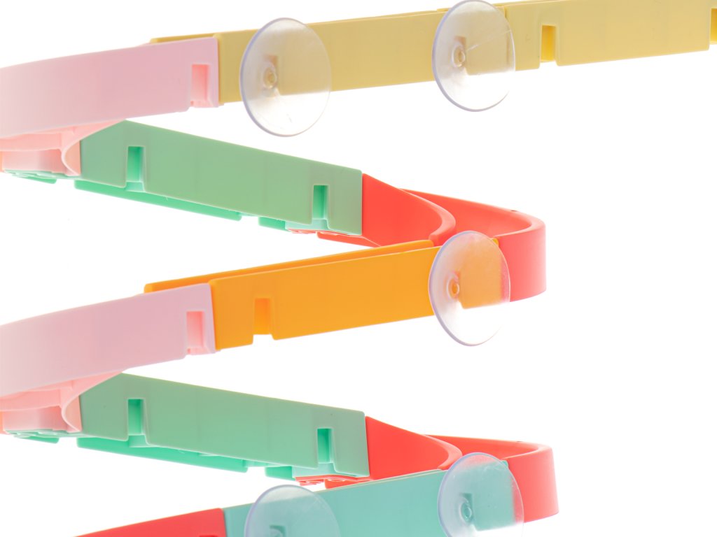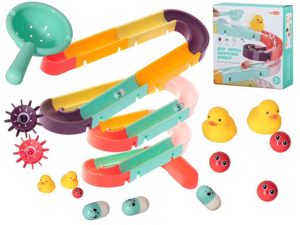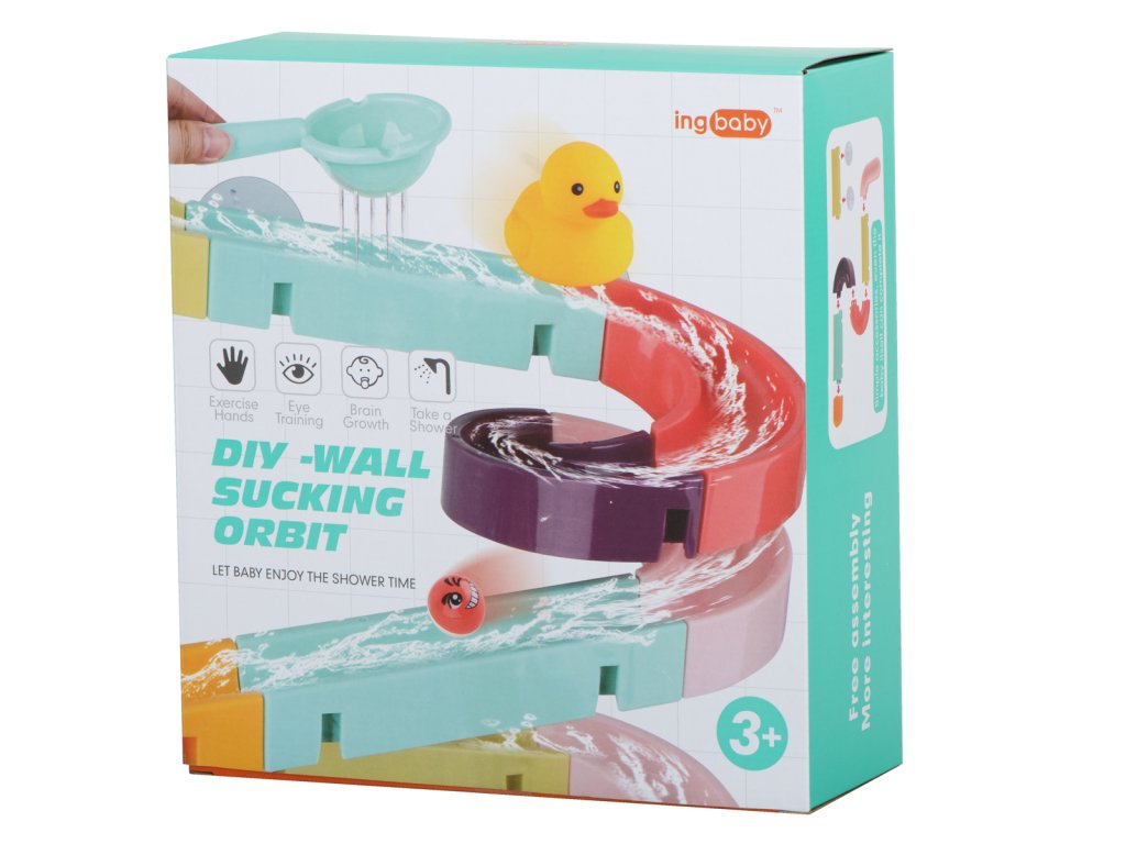 Hračka se dodává s přísavkami, které usnadňují připevnění dráhy na dlaždice nebo vanu.