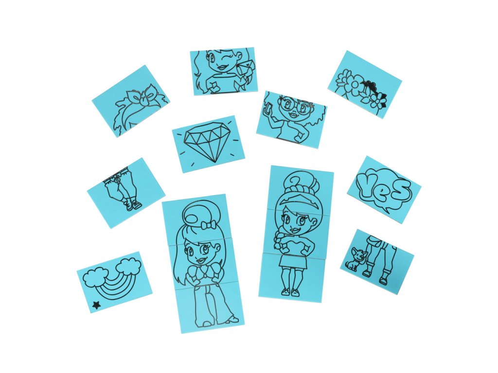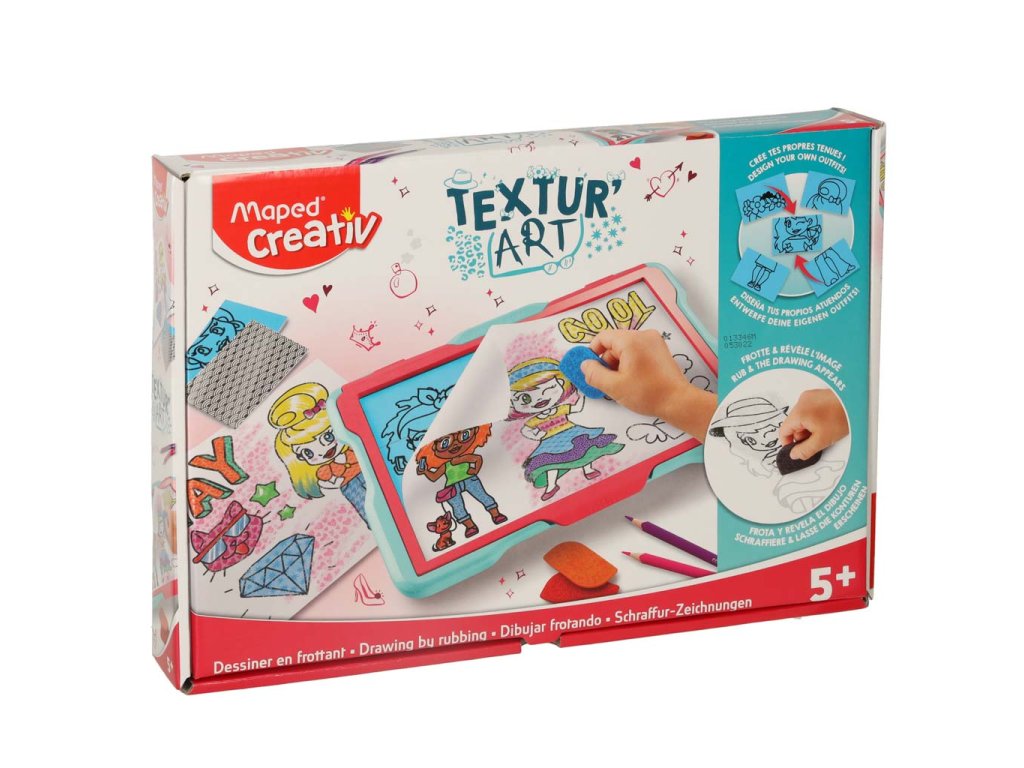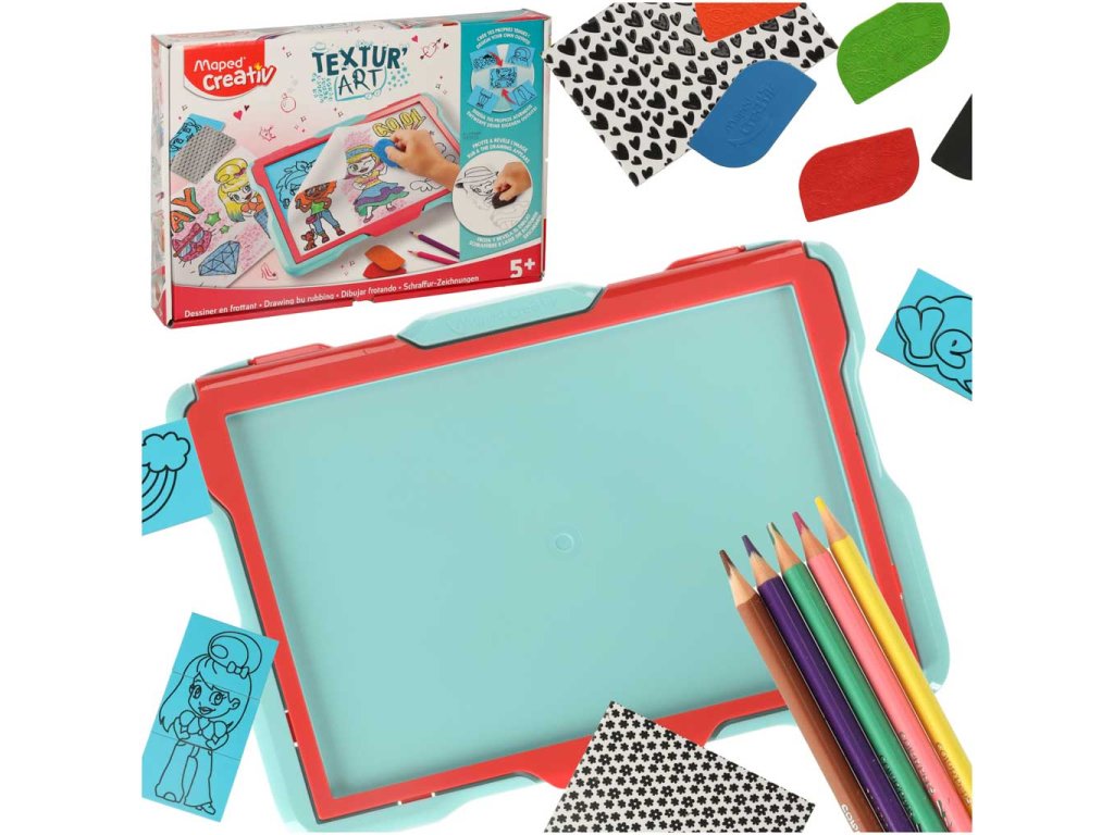 Takovou tabuli nikdo nemá - Maped Creativ ji vymyslel speciálně pro vás. Zábava je velmi jednoduchá a efekt mimořádný. Z modrých kousků kartonu si vytvoříte obrázek, který se vám líbí, pokaždé může být jiný. Položte na něj bílý list papíru, přitiskněte ho rámečkem a obkreslete obrys třením plochou pastelkou. nyní pod list papíru umístěte bílé kousky papíru se vzory, které chcete obkreslit, přejeďte po nich pastelkou v barvě, kterou si vyberete, a máte hotové květiny, skvrny, tečky, klikatky a další vzory, díky kterým bude obloha zamračená, tráva rozkvetlá a látka vašich šatů jedinečná.