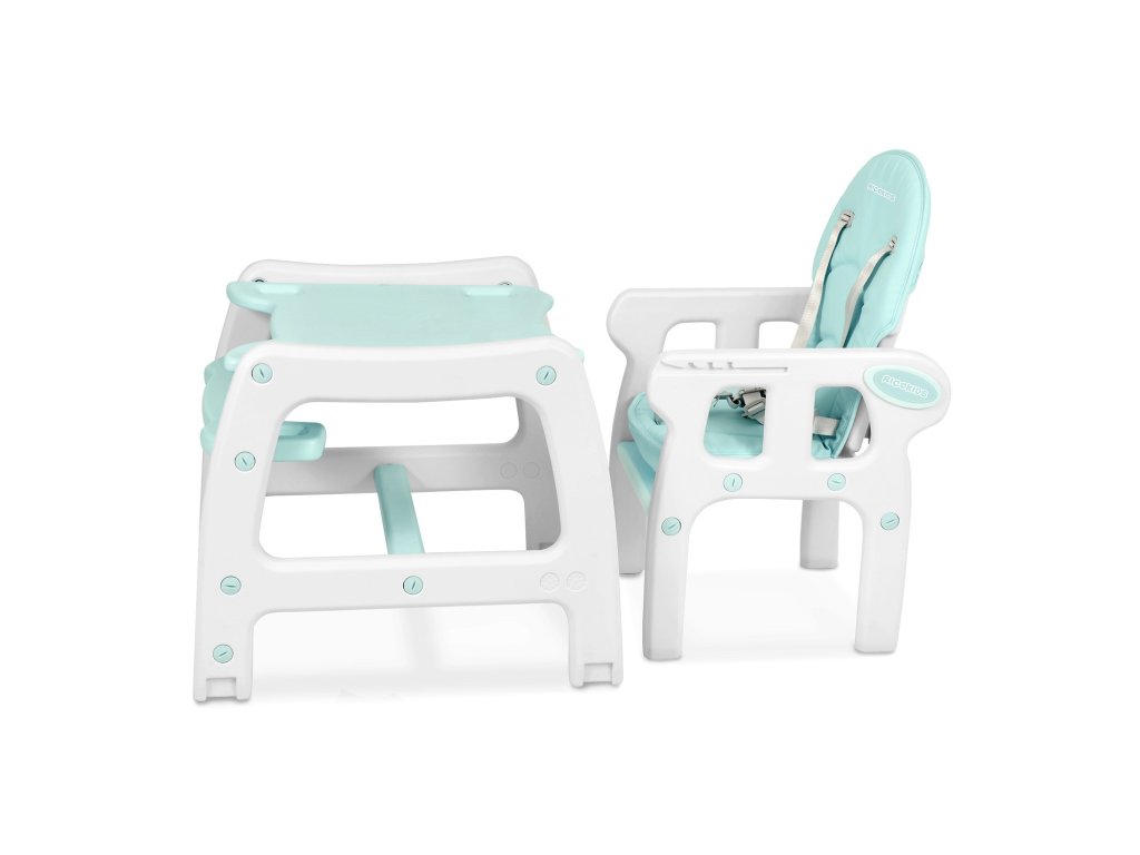 Její vzhled můžete snadno měnit podle svých potřeb a potřeb svého dítěte. Židle může fungovat jakohoupací židlička, vysoká židlička s podnosem, menší a větší vysoká židlička bez podnosu, ale takéstůl se židlí!