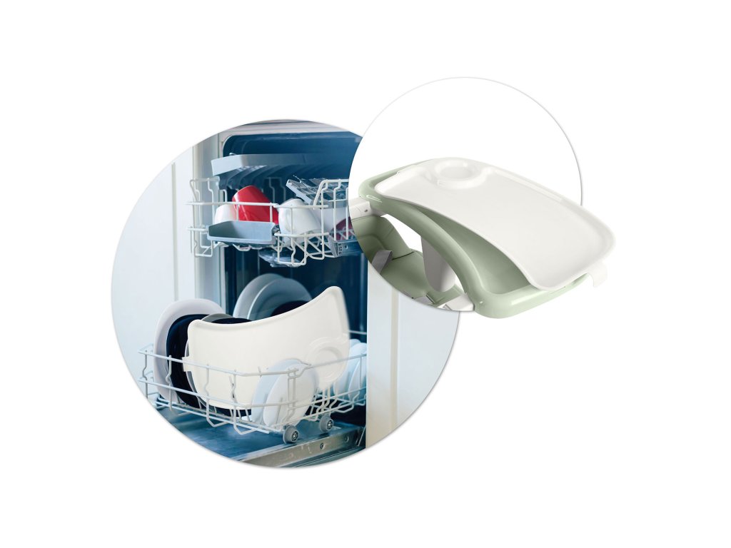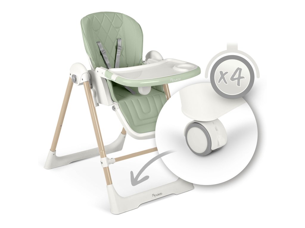 - Protiskluzové nožičky zaručují bezpečnost a kolečka usnadňují přesun židle, kamkoli potřebujete. Po odejmutí se stane dokonale stabilní pro krmení a hraní.