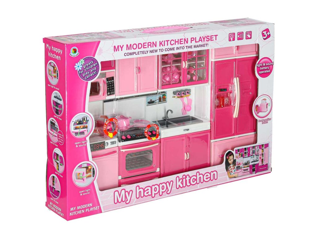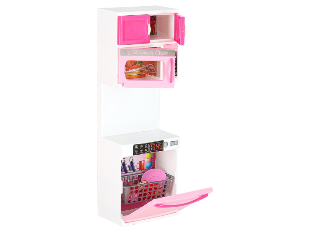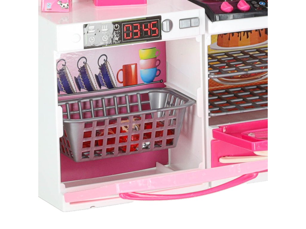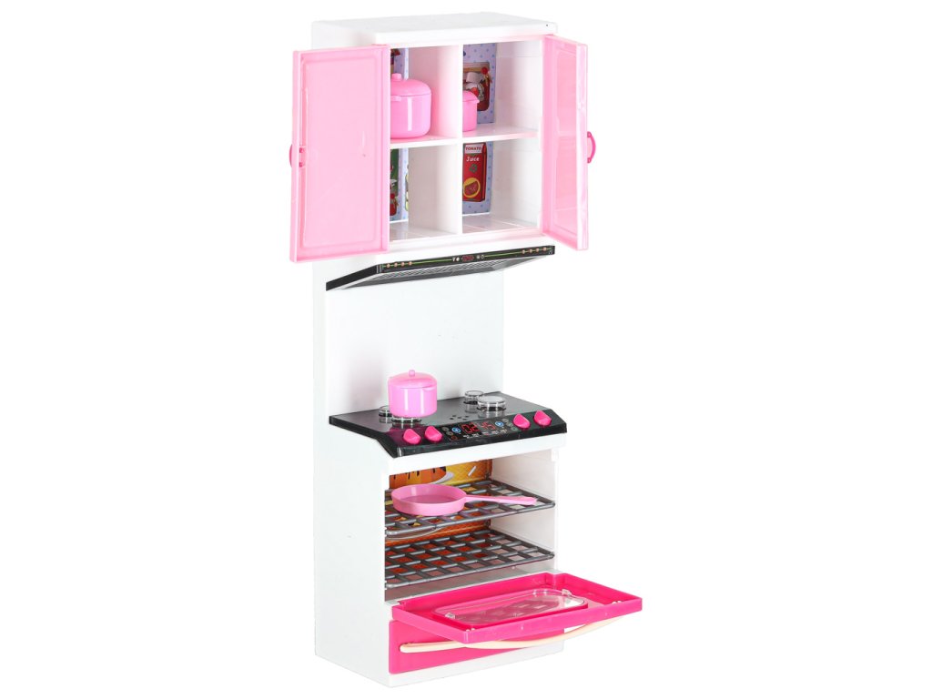 Každý segment má otevírací dvířka, vysouvá se zásuvka, trouba je osvětlena LED diodami, rozsvítí se i plynové hořáky.Funkce Dvířka se otevírají, trouba se rozsvítí, rozsvítí se i plynové hořáky.Při hře s nábytkem dítě ztvárňuje situace, které zná z každodenního života. Touto činností se batole učí společenskému chování, projevům zdvořilosti a uvědomování si povinností (např. aby se najedlo, musí se uvařit a pak umýt). při takové hře si dítě rozvíjí manuální dovednosti, protože hra vyžaduje uchopení, míchání a otevírání.Společnou hrou může rodič děti těmto návykům a povinnostem naučit, navíc společně strávený čas posiluje vazby a buduje důvěru. naše děti se chtějí účastnit tohoto typu hry i každodenního života, protože jim přináší uspokojení a zvyšuje jejich sebevědomí, a hlavně jim dává pocit smysluplnosti a sounáležitosti se společenstvím, ve kterém žijí.