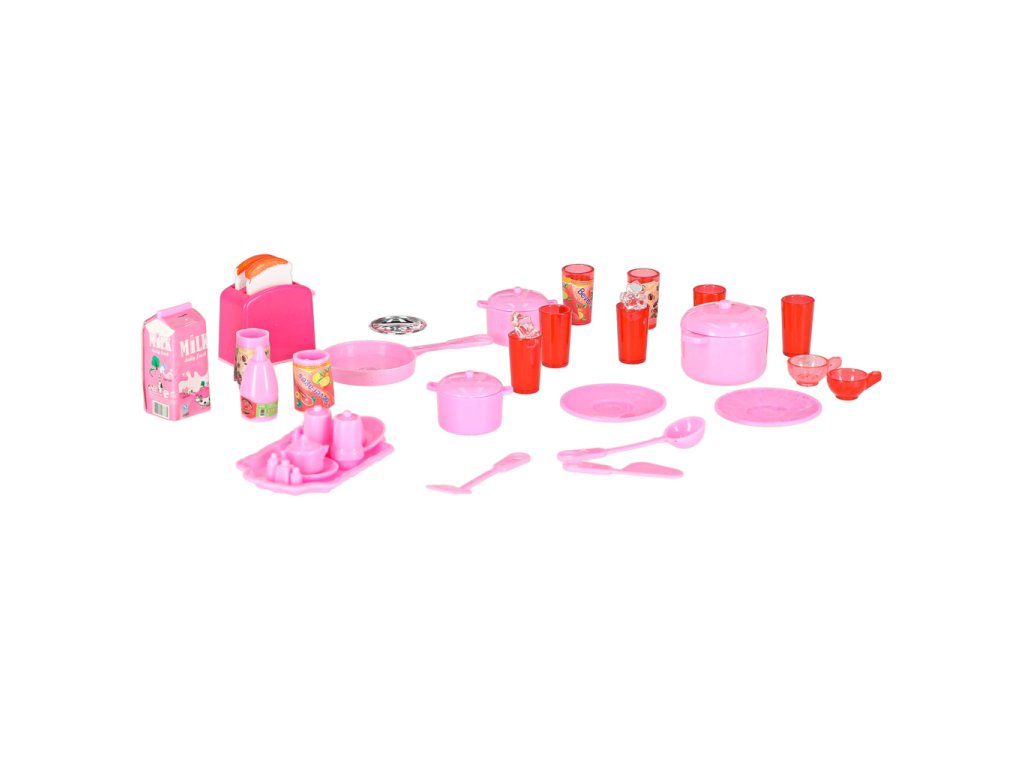 Obsah sady: skříňky, mikrovlnná trouba, myčka, trouba, vitrína, dřez, lednice, zásuvka, krabice na mléko, plastové kelímky 3 ks, hrnek na kávu, toustovač s pohyblivou rukojetí na opékání, pánev, hrnec s pokličkou - 2 ks, plastová stěrka 2 ks, plastová naběračka, sada na kávu, kostky ledu.