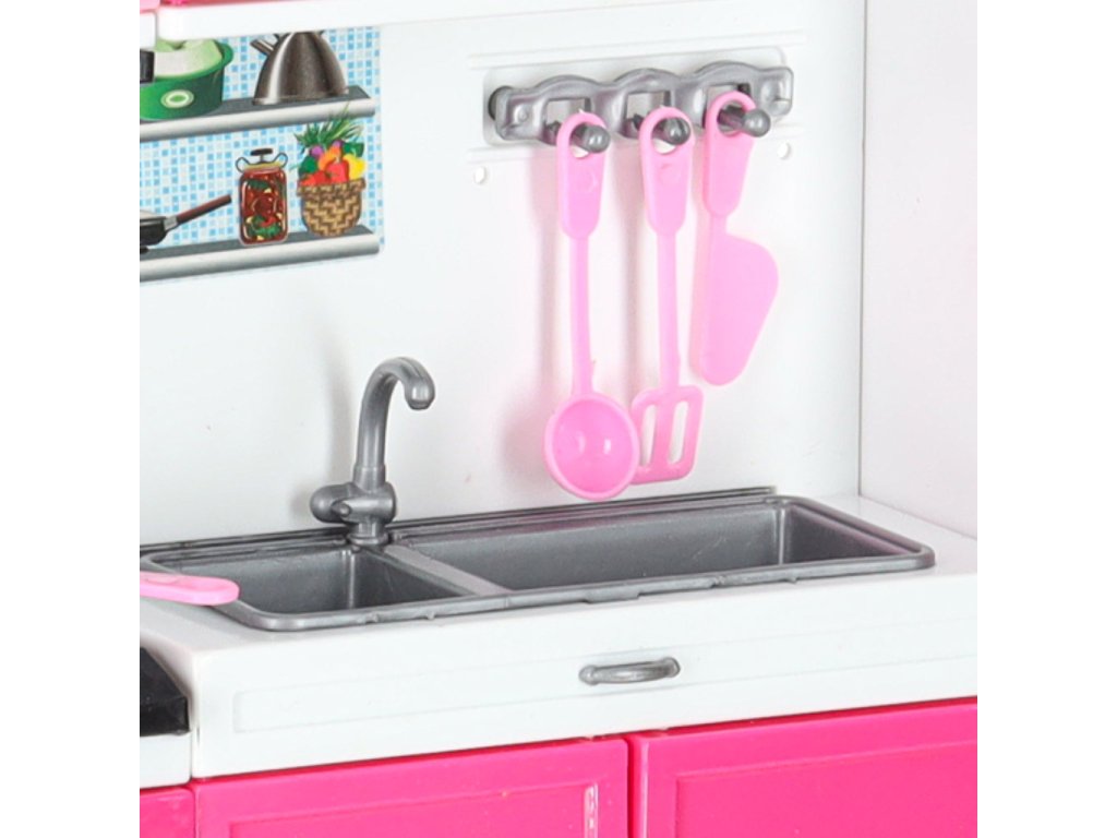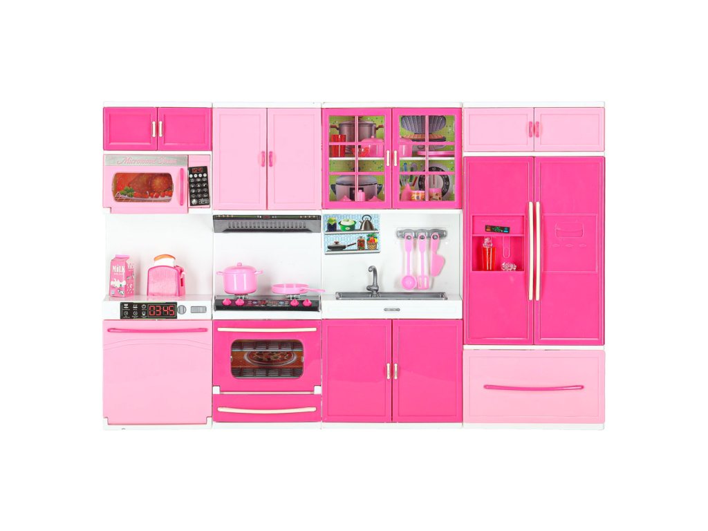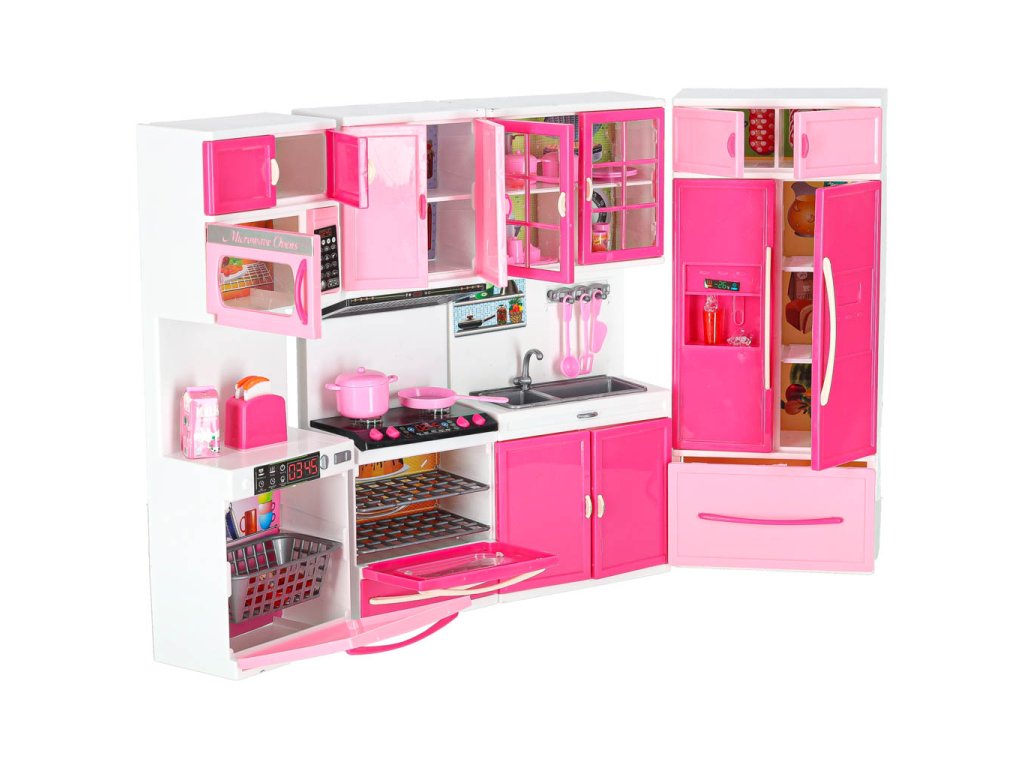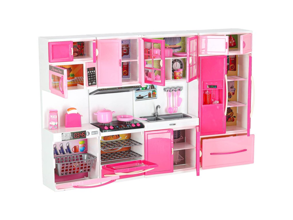 Vaše dětské panenky si zaslouží mít krásnou kuchyňku.Tato čtyřmodulová sada vám poskytne skvělou zábavu. Kuchyňka obsahuje: I. segment: skříňku s mikrovlnnou troubou a myčkou, II. segment: skříňku s plynovým sporákem a troubou, III. segment: vitrínu se skříňkou a dřezem, IV. segment: skříňku s vestavěnou lednicí a zásuvkou.Součástí sady je také příslušenství, jako je krabice na mléko, 3 plastové hrnky, šálek na kávu, topinkovač s pohyblivou rukojetí na opékání, pánev, dva hrnce s pokličkami, dvě plastové špachtle, plastová naběračka, sada na kávu, kostky ledu.