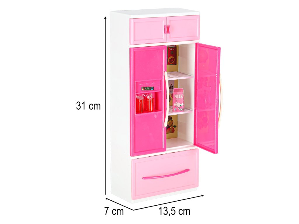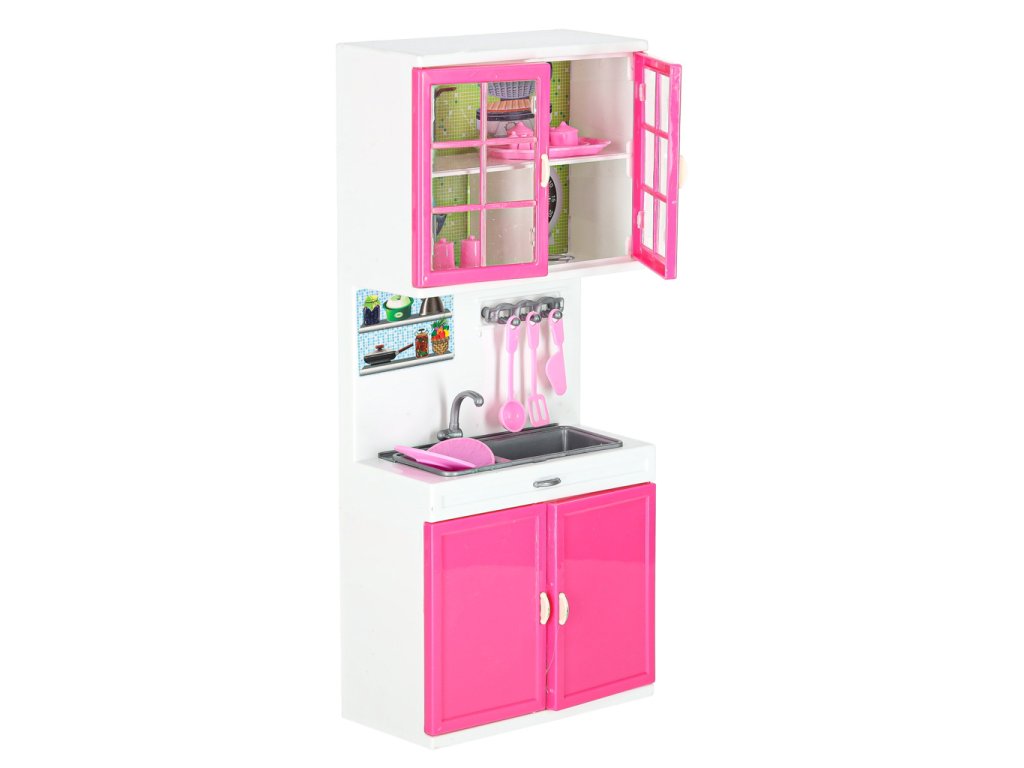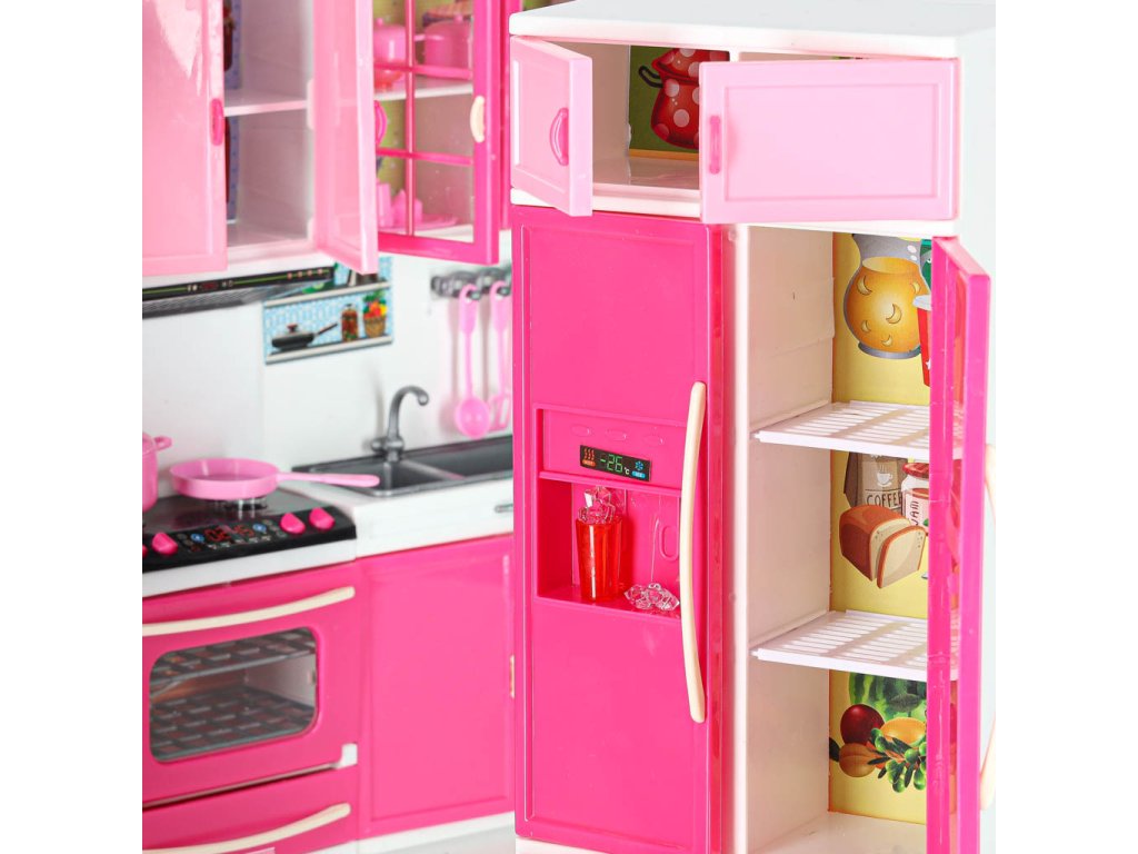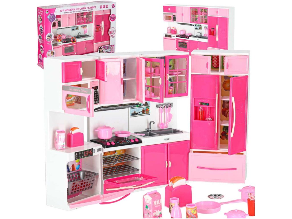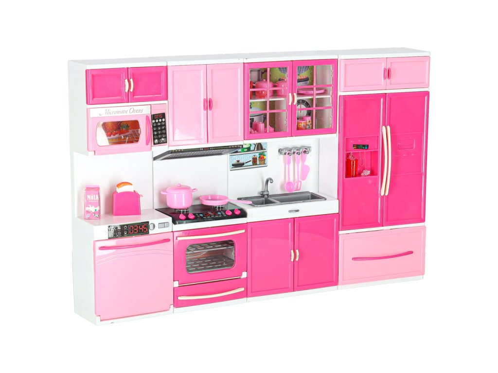 Vaše dětské panenky si zaslouží mít krásnou kuchyňku.Tato čtyřmodulová sada vám poskytne skvělou zábavu. Kuchyňka obsahuje: I. segment: skříňku s mikrovlnnou troubou a myčkou, II. segment: skříňku s plynovým sporákem a troubou, III. segment: vitrínu se skříňkou a dřezem, IV. segment: skříňku s vestavěnou lednicí a zásuvkou.Součástí sady je také příslušenství, jako je krabice na mléko, 3 plastové hrnky, šálek na kávu, topinkovač s pohyblivou rukojetí na opékání, pánev, dva hrnce s pokličkami, dvě plastové špachtle, plastová naběračka, sada na kávu, kostky ledu.
