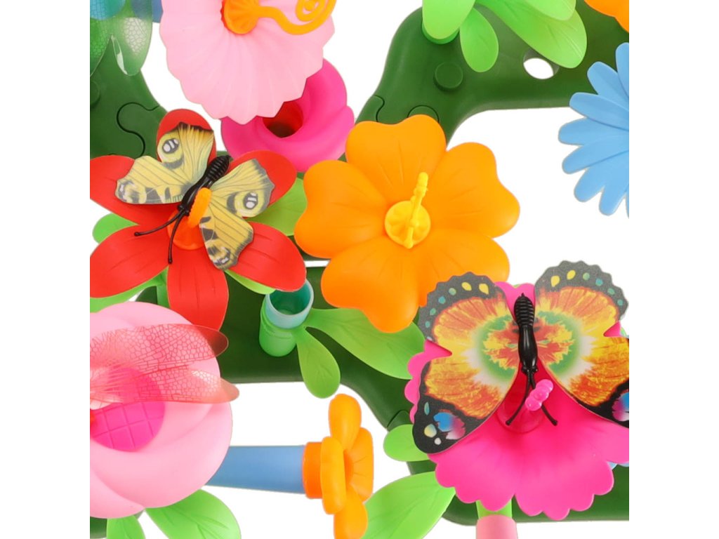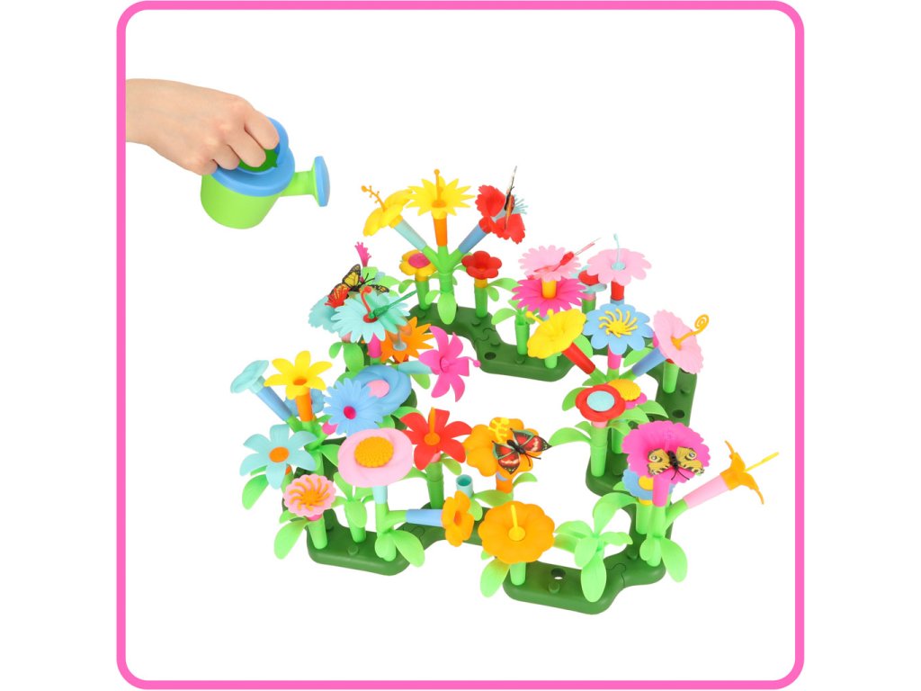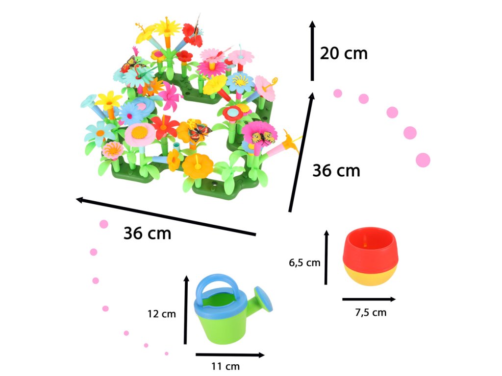 Zábavná zahrada pro děti od 3 let. Obsahuje 175 dílků k sestavení zahrádky, vázu, konev a květinu. Rozměry: 36x36x20 cm. Kreativní hra pro malé zahradníky.