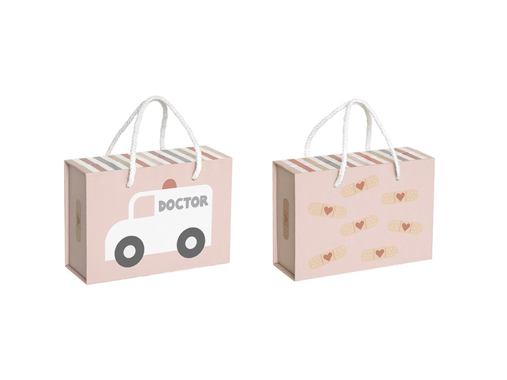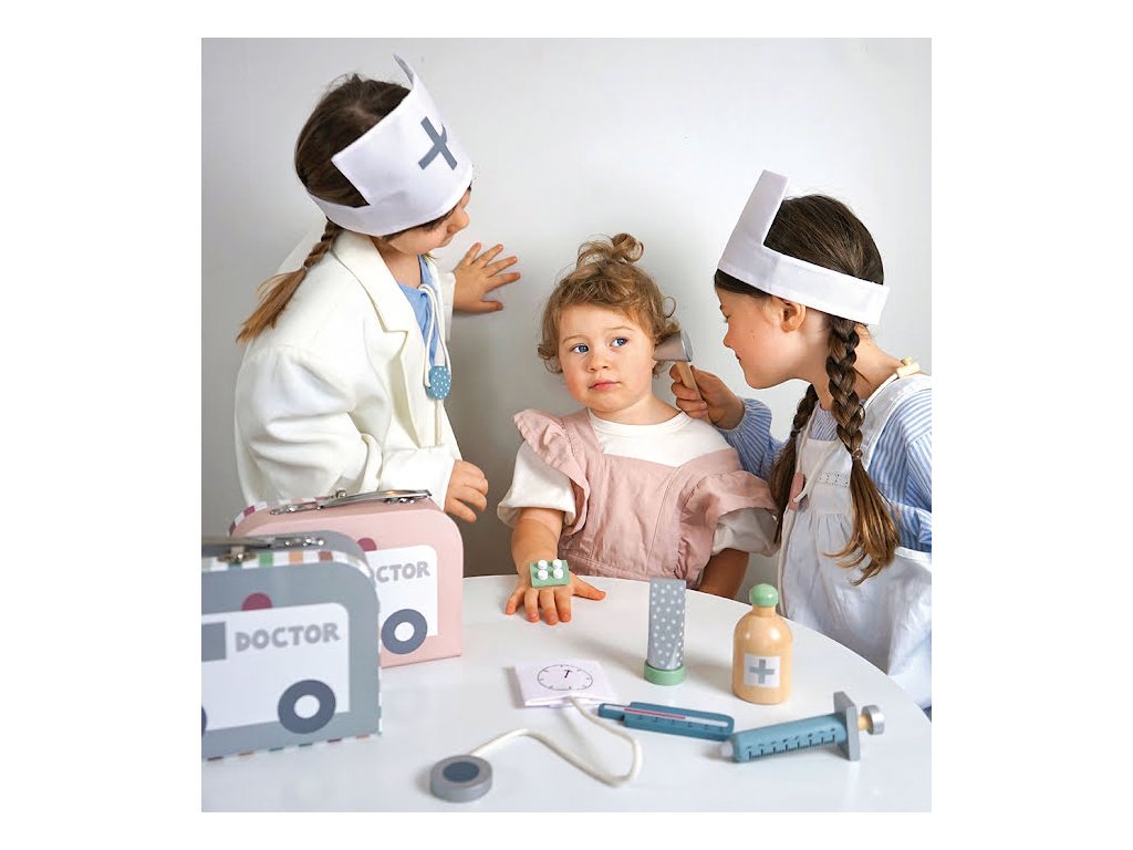 Vítejte u lékaře! Lékařský kufřík Jabadabad obsahuje veškeré vybavení, které potřebujete k tomu, abyste své rodině, přátelům a domácím mazlíčkům poskytli tu nejlepší péči. Nikdy nevíte, kdo bude potřebovat navštívit malého lékaře. Vaše dítě si s touto lékařskou soupravou, která podporuje kreativní hru a povzbuzuje je k péči a pomoci, užije spoustu zábavy. Sada obsahuje: 1x injekční stříkačka 1x dřevěný stetoskop 1x teploměr 1x mast 1x tlakoměr 1x lékařská čepice 1x lahvička 1x otoskop (nástroj na oči a uši)