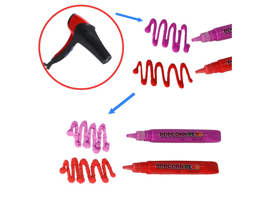 Po dokončení kreslení vezměte do ruky fén a nasměrujte teplý vzduch z fénu na vytvořené dílo. Po krátké chvíli barevné čáry začnou "bobtnat" a zvětšovat svůj objem, jako když se kukuřičné zrno mění v popcorn . Takové divadlo jste ještě neviděli!