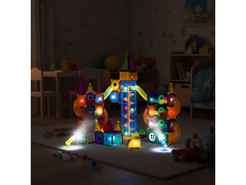 Magnetické svietiace stavebné kocky s guľôčkovou dráhou 134 ks