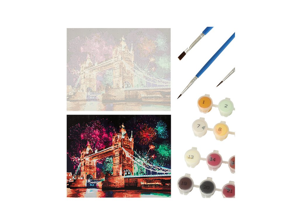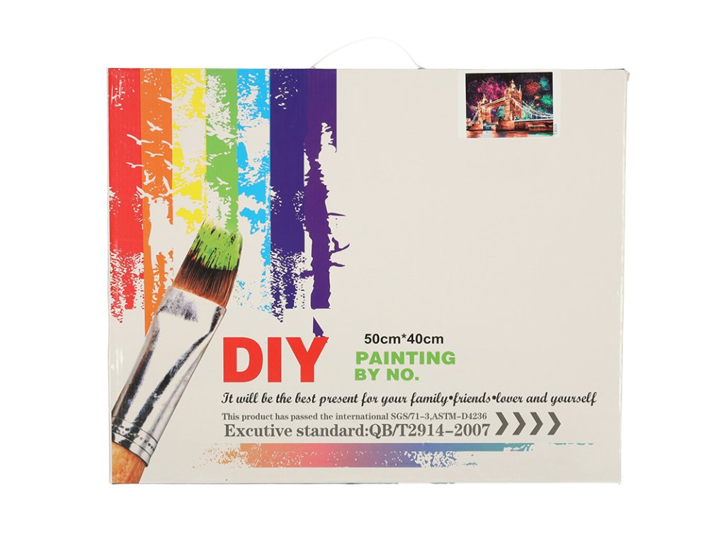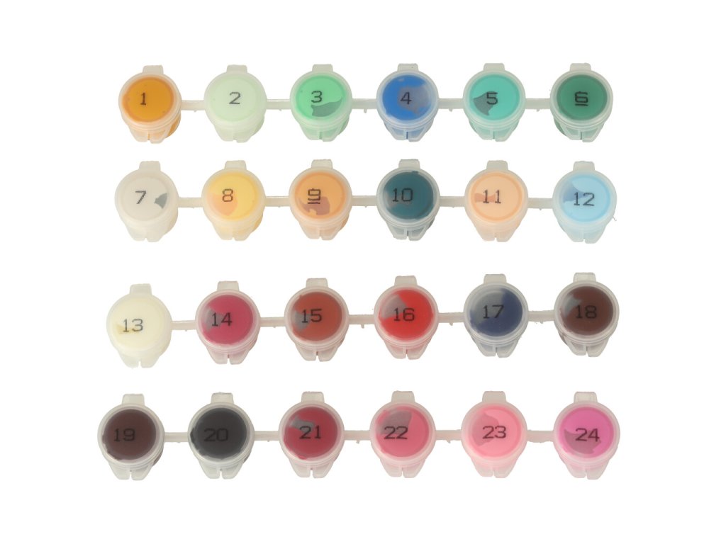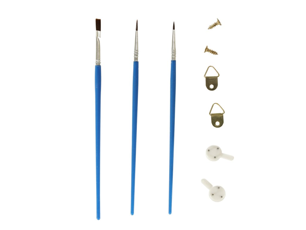 Malířská sada obsahuje rám na plátno, štětce, 24 barev, závěs, šrouby, kolíčky a miniaturu. Rozměry plátna: 50 x 40 cm. Kvalitně zabaleno v kartonovém obalu.