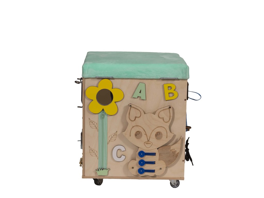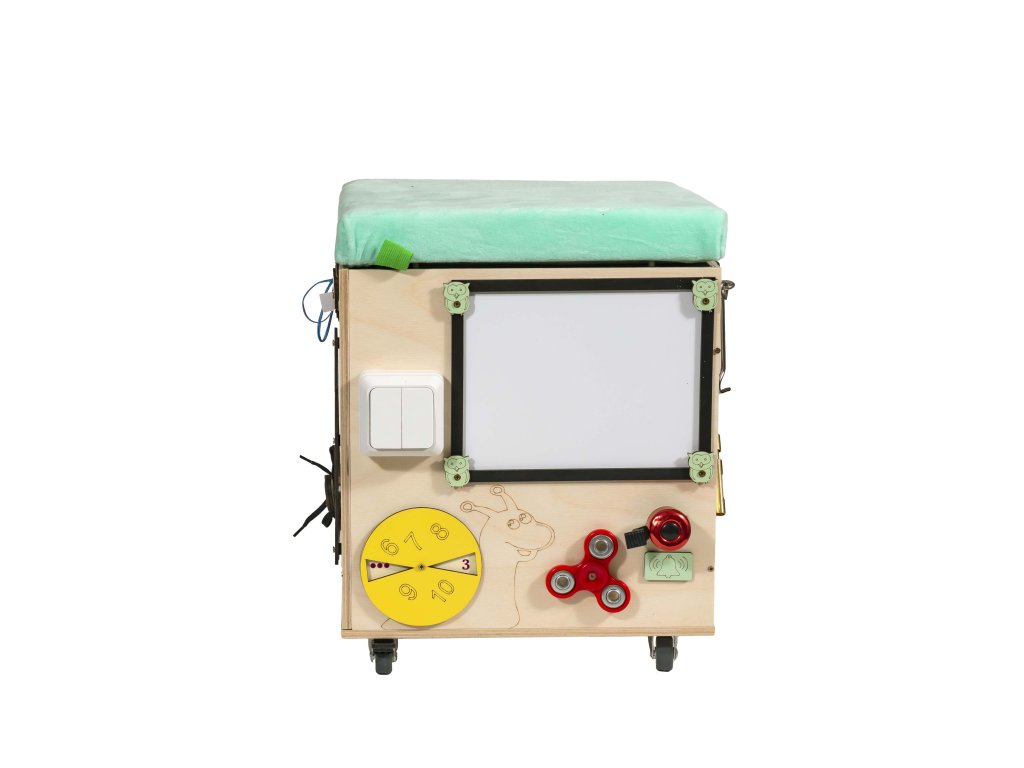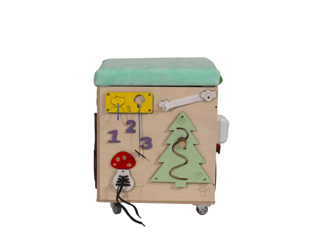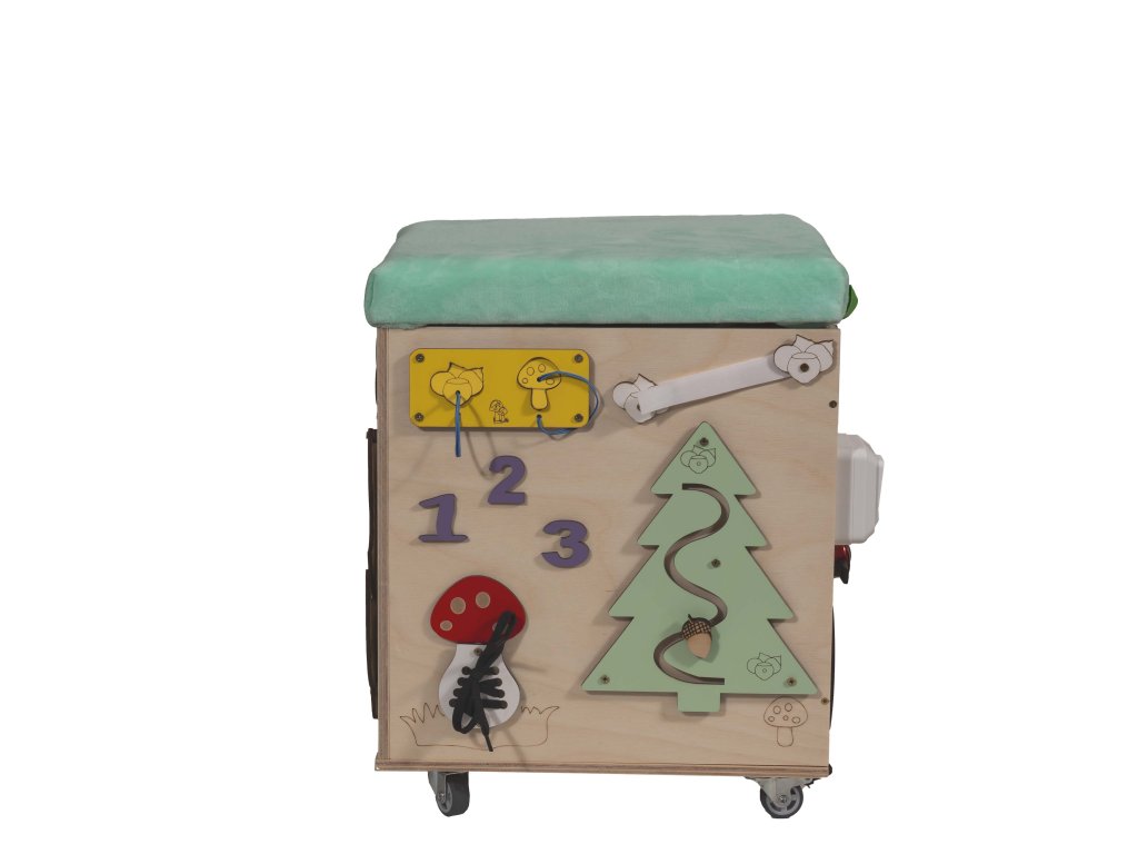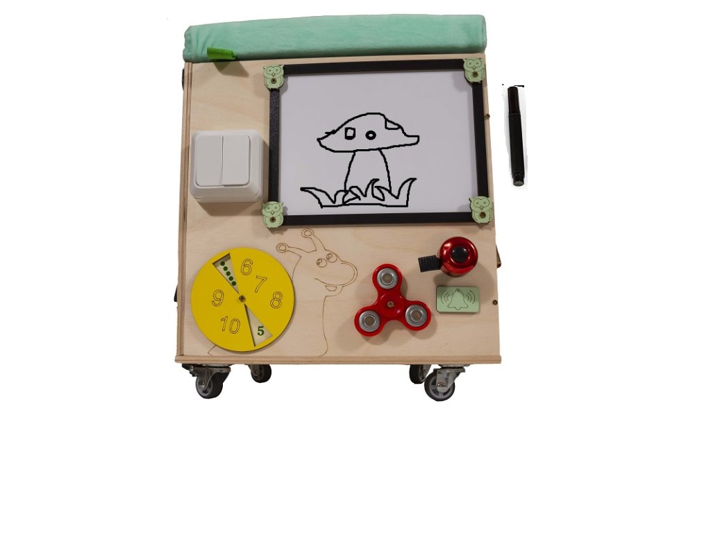 Manipulační puf LAS s pohyblivými kolečky a výukovými pomůckami. Zábavný nábytek se šňůrkou, tabulkou na psaní a zipem. Ideální pro učení a hraní. Měkké sedátko s houbou a fleecem. Zvyšuje kreativitu a dovednosti.