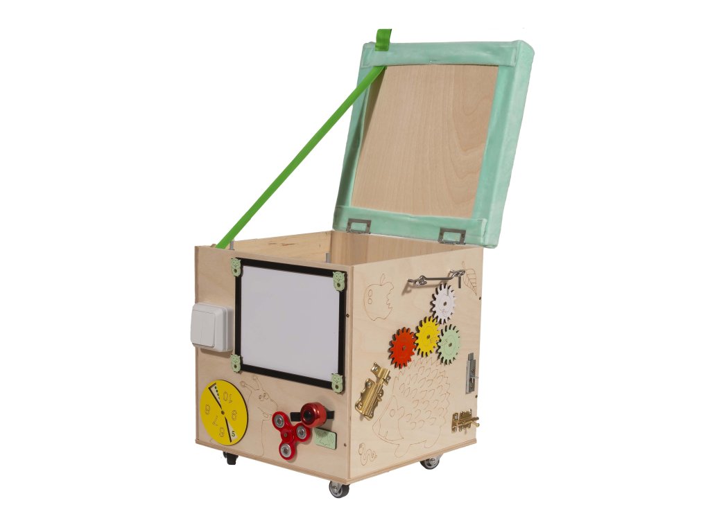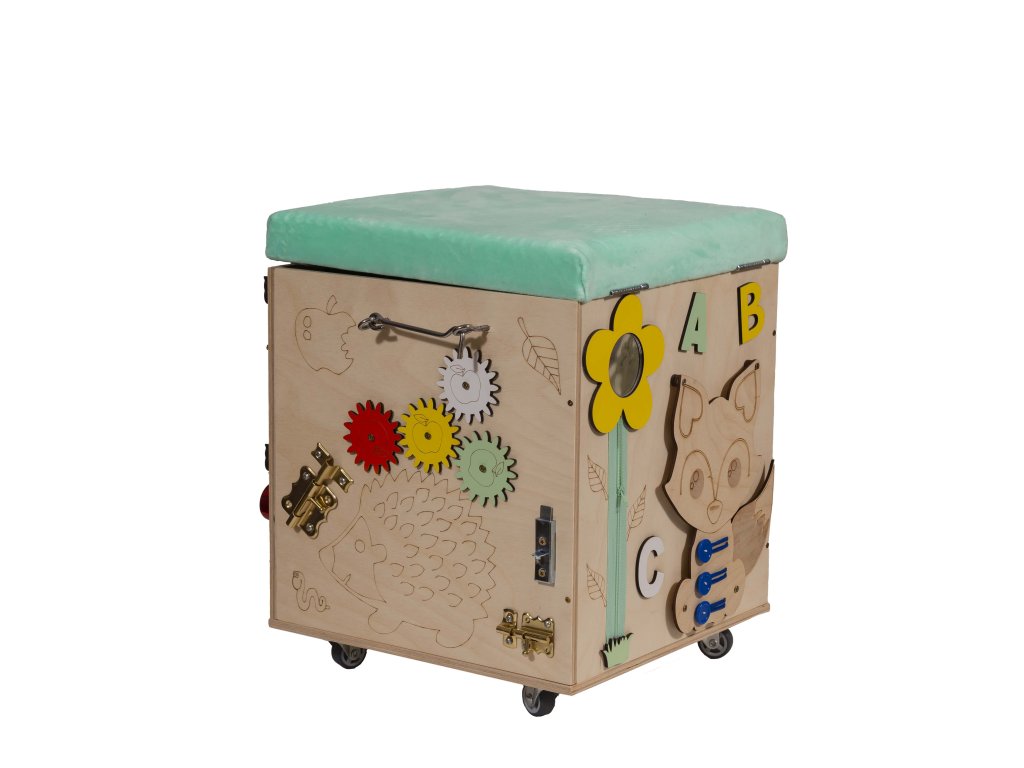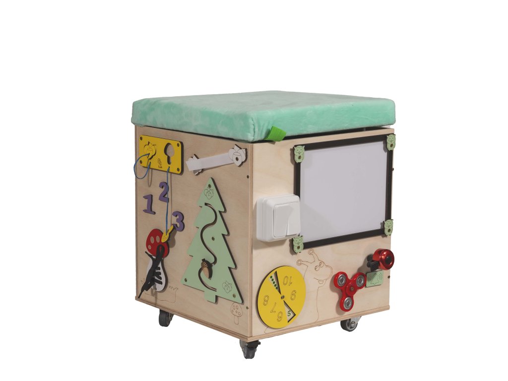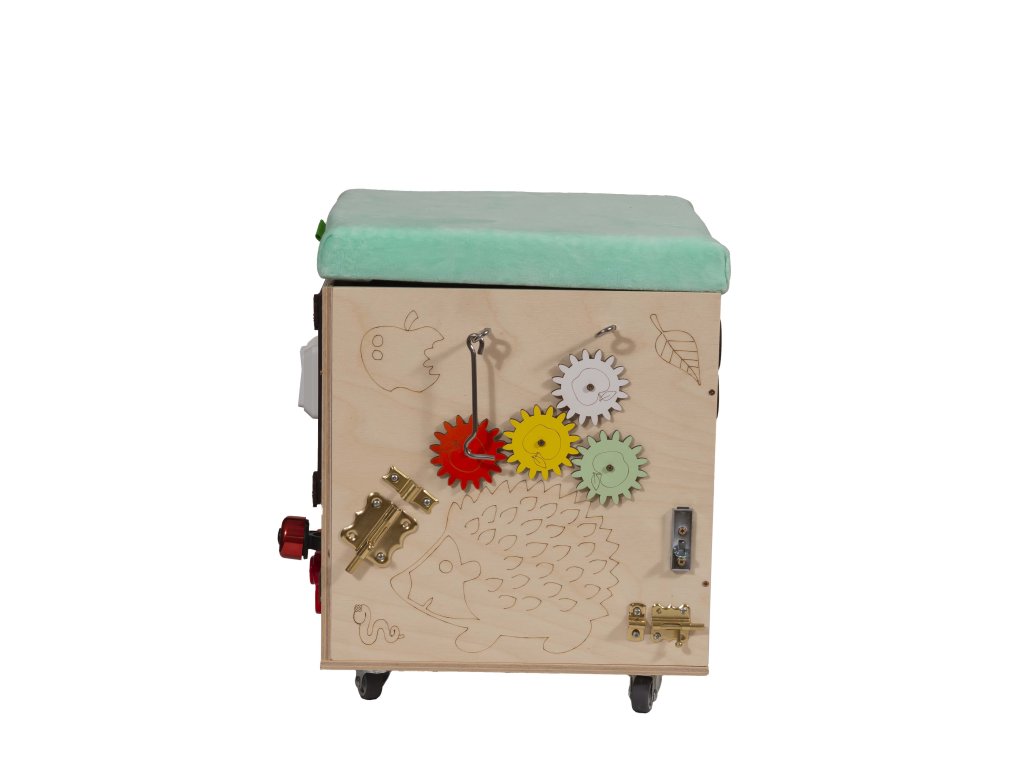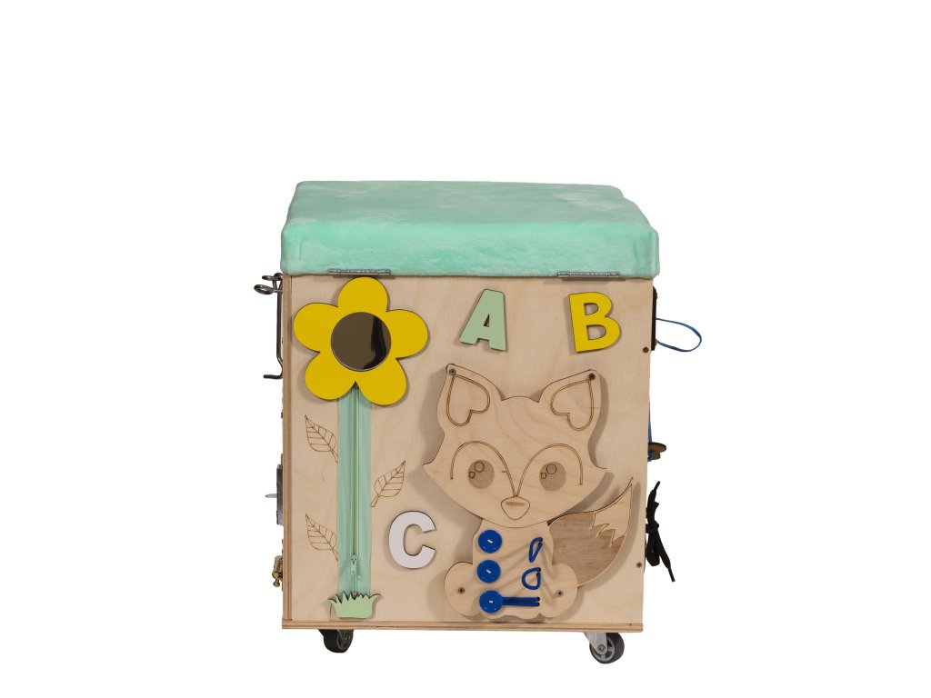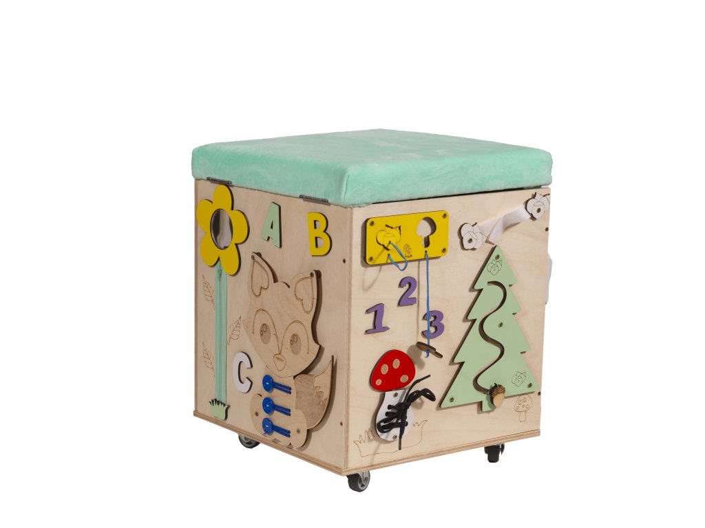 Manipulační puf LAS s pohyblivými kolečky a výukovými pomůckami. Zábavný nábytek se šňůrkou, tabulkou na psaní a zipem. Ideální pro učení a hraní. Měkké sedátko s houbou a fleecem. Zvyšuje kreativitu a dovednosti.