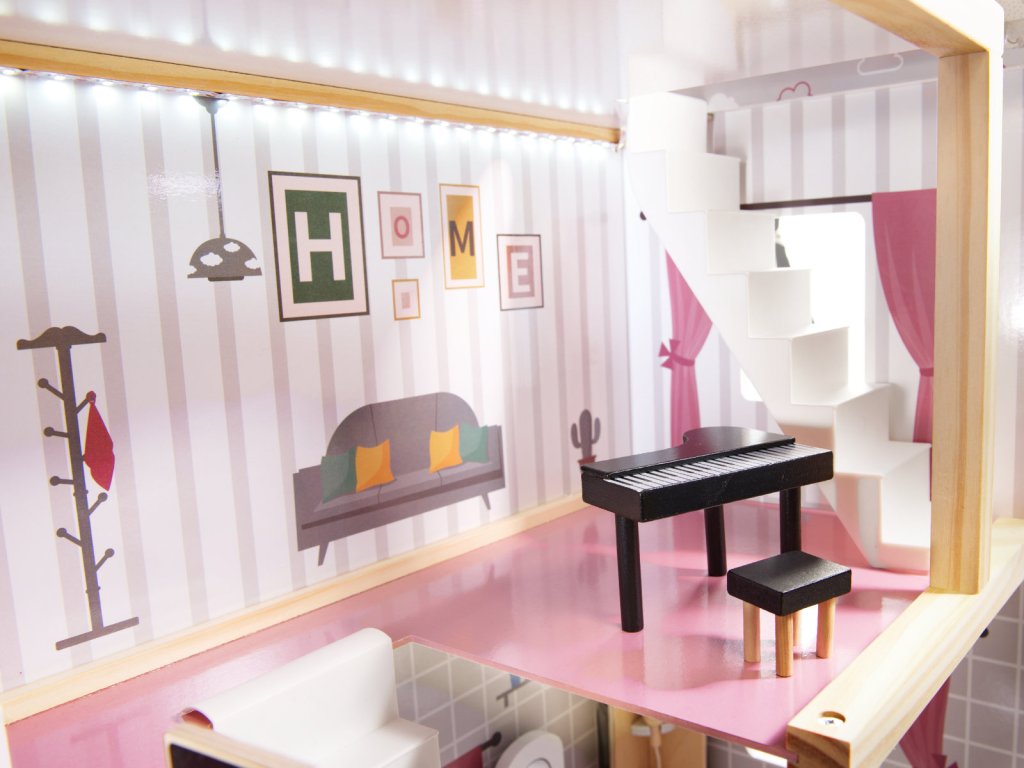 Moderní dřevěný domek pro panenky se 4 pokoji a terasou. Plně vybavený LED osvětlením, dřevěným nábytkem a detaily. Podporuje dětskou kreativitu a manuální zručnost a zároveň je bezpečný a estetický. Rozměry: 62 x 27 x 78 cm. Ideální doplněk do dětského pokoje.