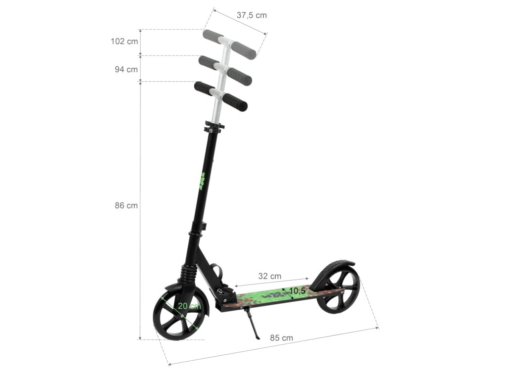- Materiály: palubní deska, řídítka, třmen, brzda: hliník; Řídicí tyč, vidlice: ocel; Kola: PU