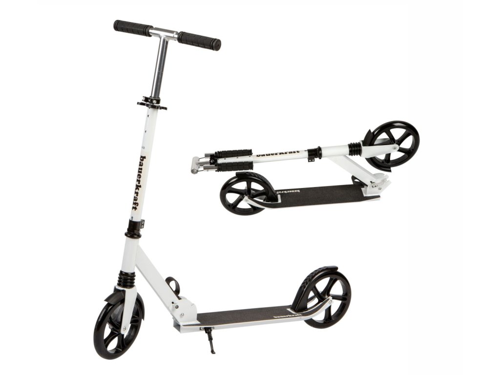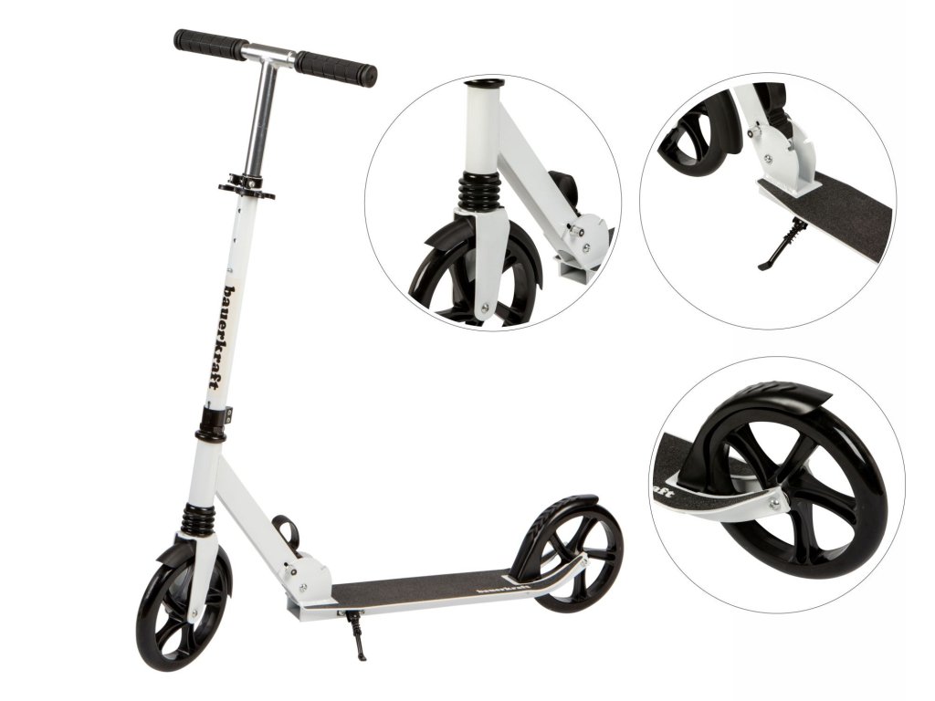 - Praktická noha umožňuje bezpečne odložiť kolobežku kdekoľvek bez rizika jej prevrátenia.